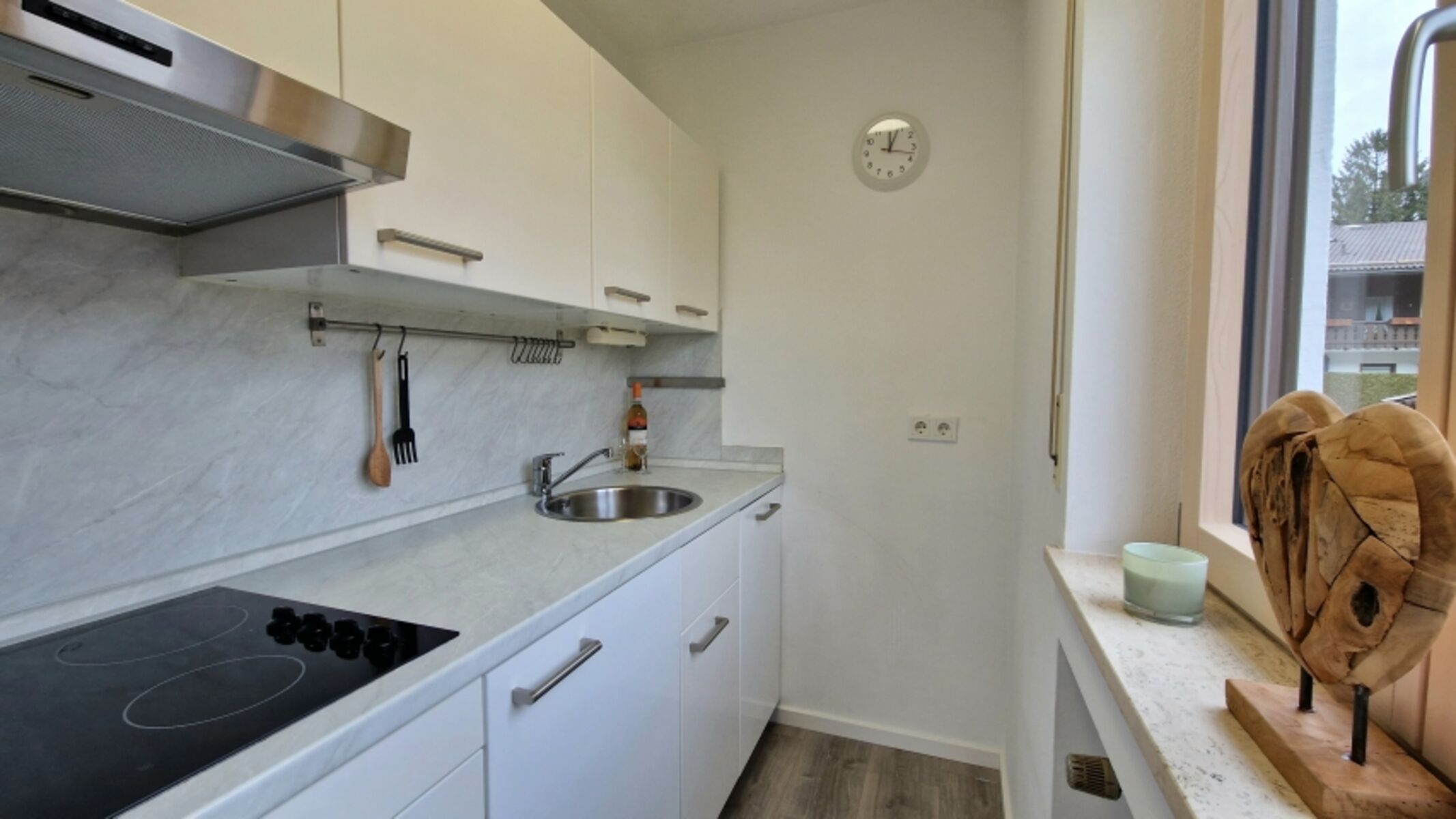 Cerankochfeld, Dunstabzugshaube, Kühlschrank mit Gefrierfach, Korkenzieher / Flaschenöffner, Mülltüten