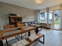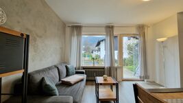 Die neu renovierte und gemütlich eingerichtete Wohnung hat einen Wohnraum mit Essplatz und einer Sitzgruppe mit Schlafcouch. Es gibt eine kleine Küche mit Geschirrspülmaschine. Im Schlafzimmer befinden sich ein Doppelbett, 2 kleine Kommoden und ein geräumiger Schrank. Vom Wohnzimmer aus kann man die sonnige Südterrasse mit Garten betreten. Die Wohnung verfügt über ein Duschbad mit WC. Gartenmöbel sind vorhanden.