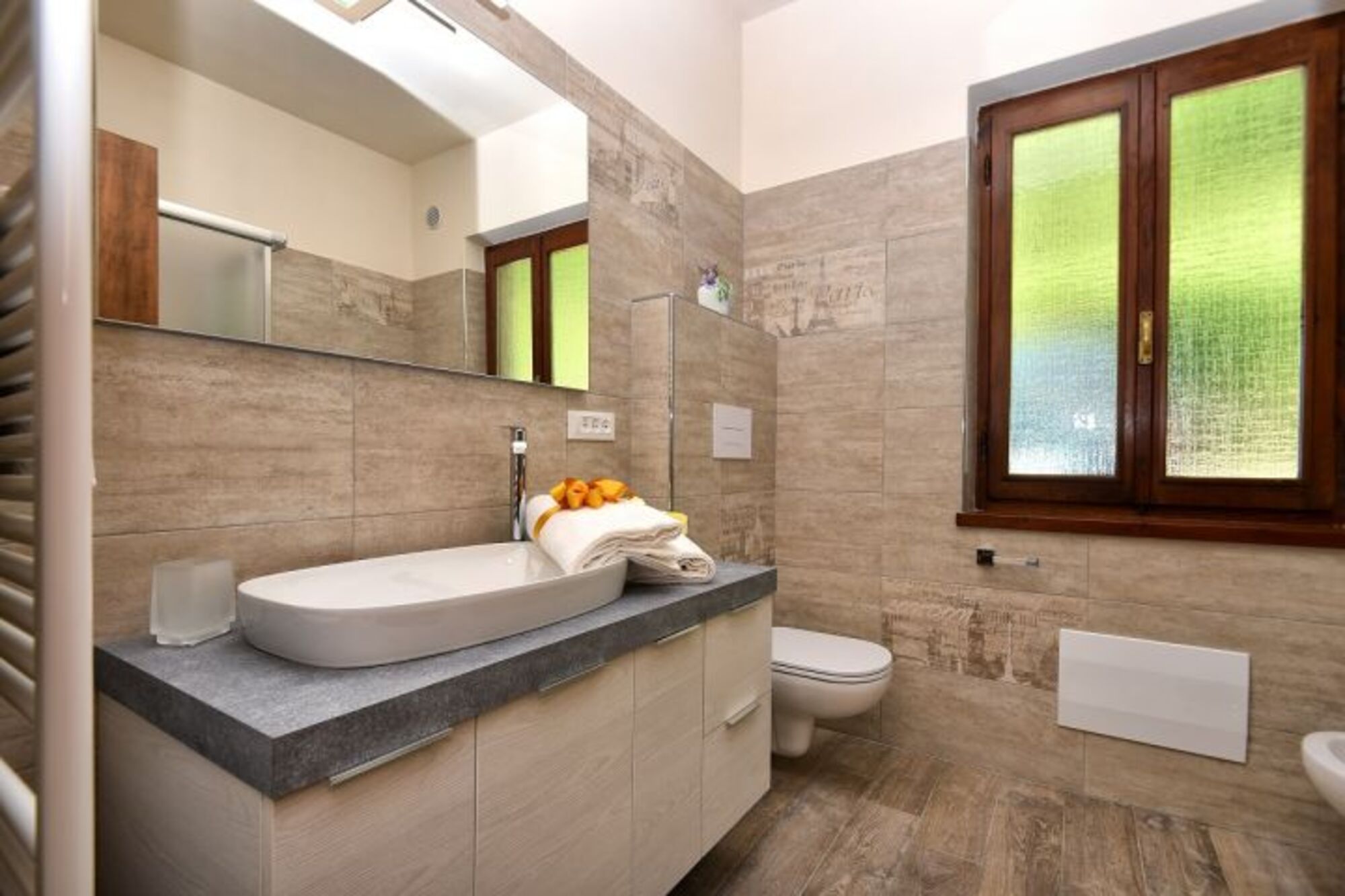 Bidet Waschbecken, Spiegel, Fenster im Bad