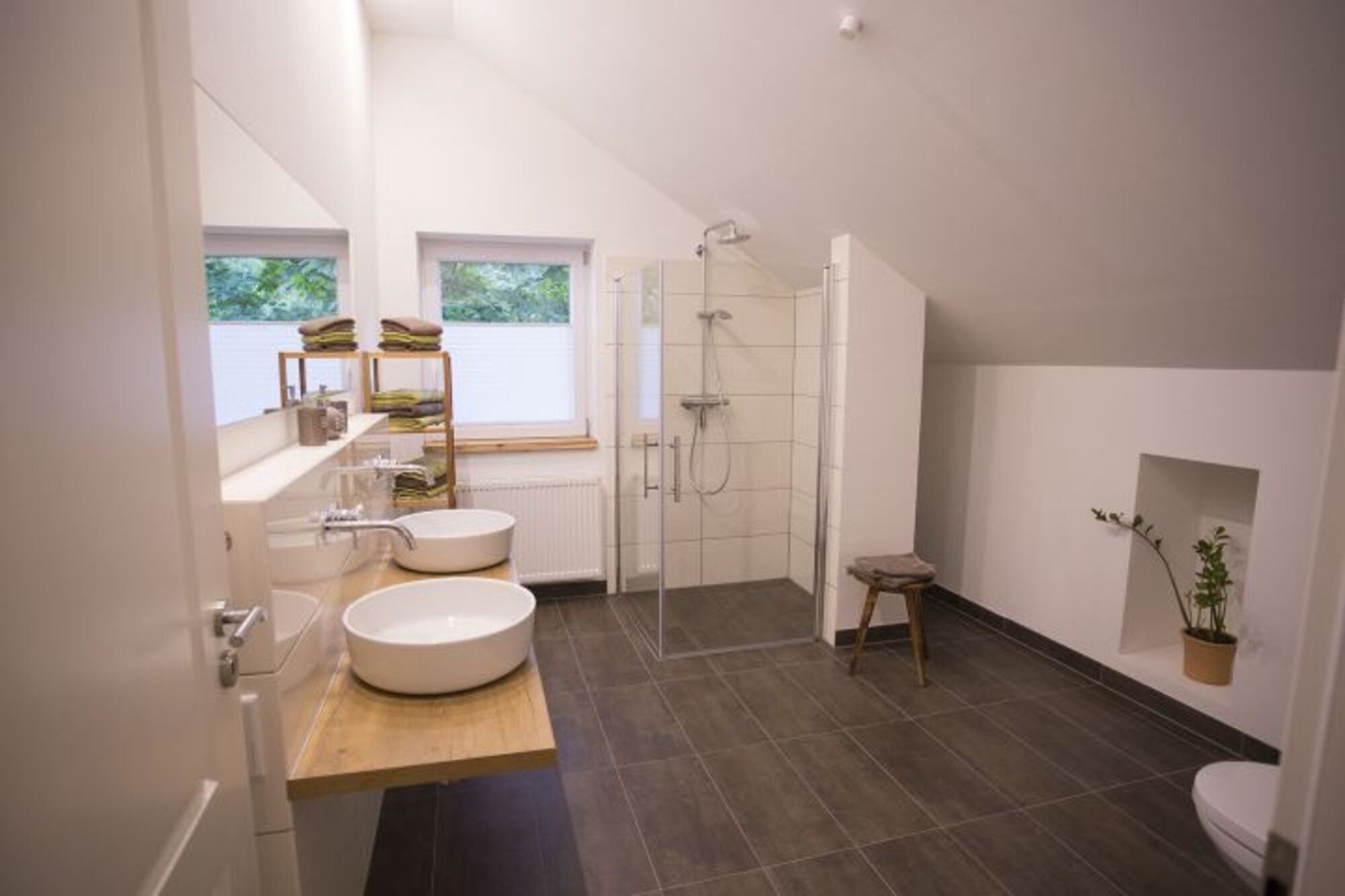 Doppelwaschbecken, Regendusche, Kosmetiktücher, Spiegel, Fenster im Bad