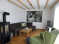 TV, TV-Sat, TV-Flachbildschirm, HDTV Flachbildschirm, Bücher, Kaminofen, Eckcouch, Sessel