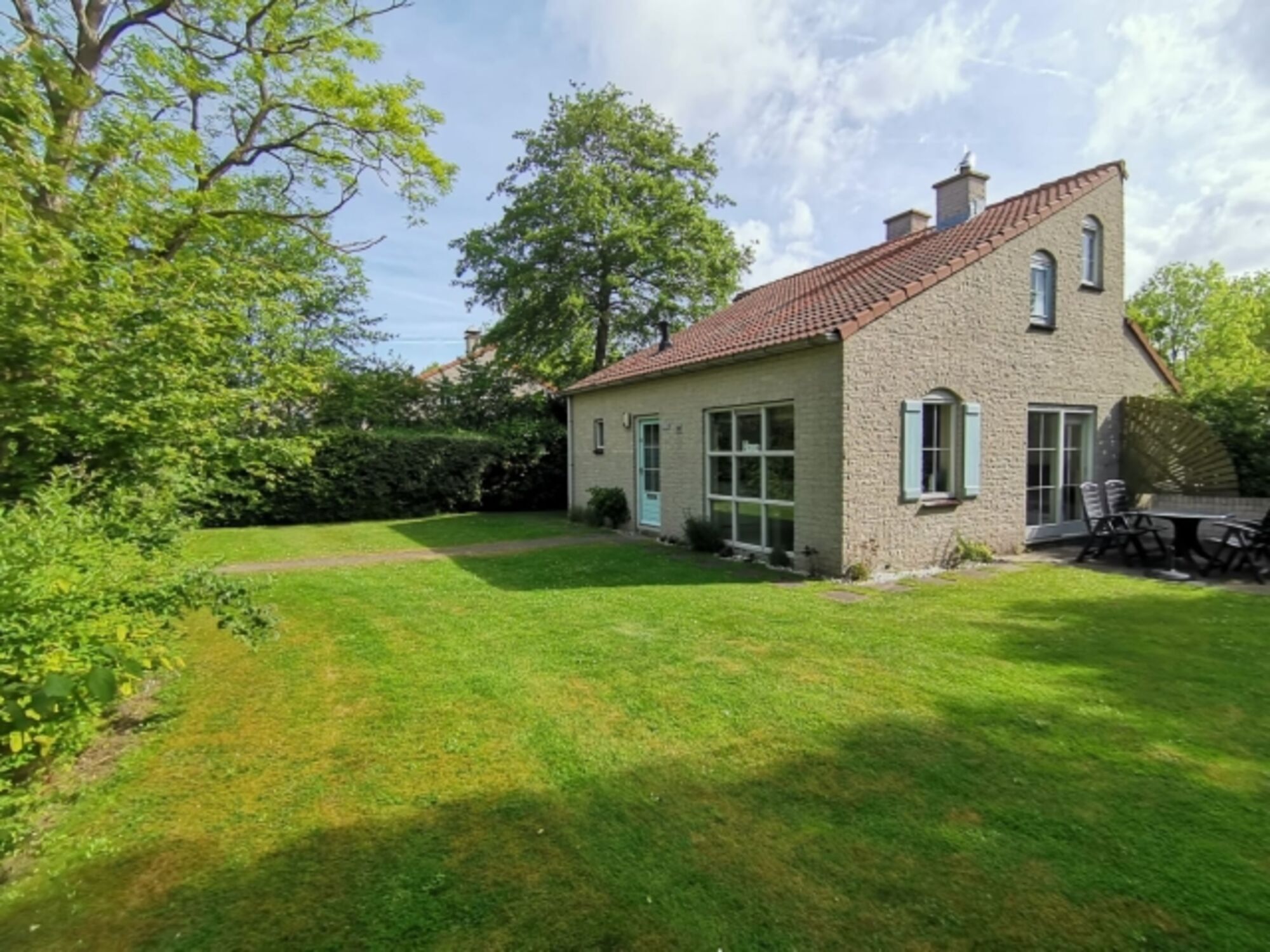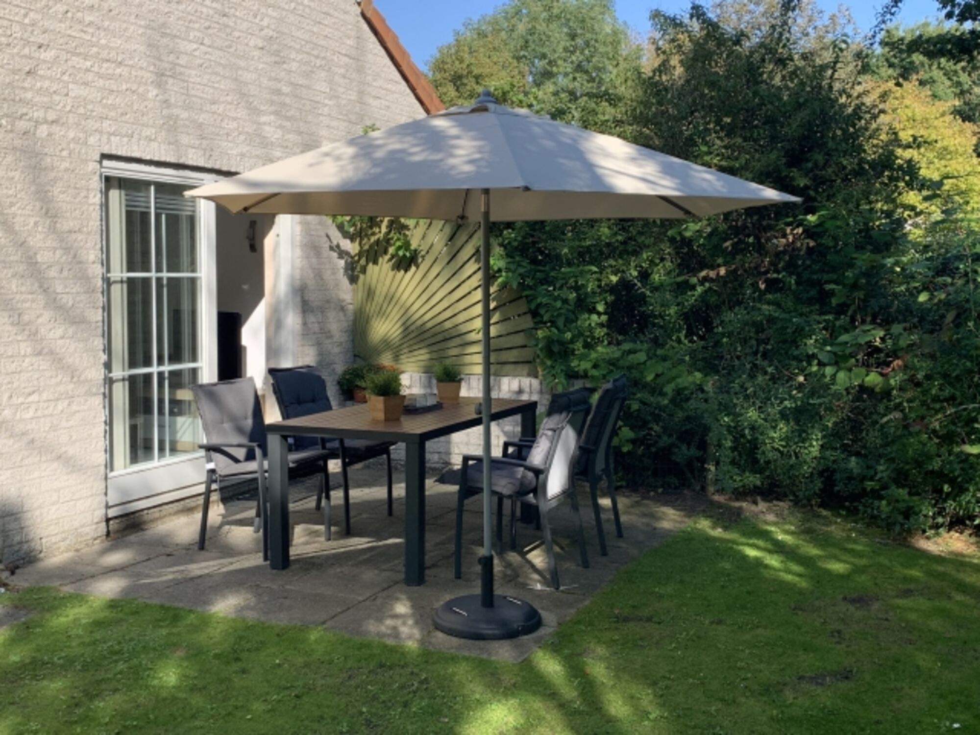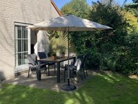 Der große Garten mit schöner Terasse bietet Entspannung pur. Er ist umgeben von Hecken und von außen kaum einsehbar.
