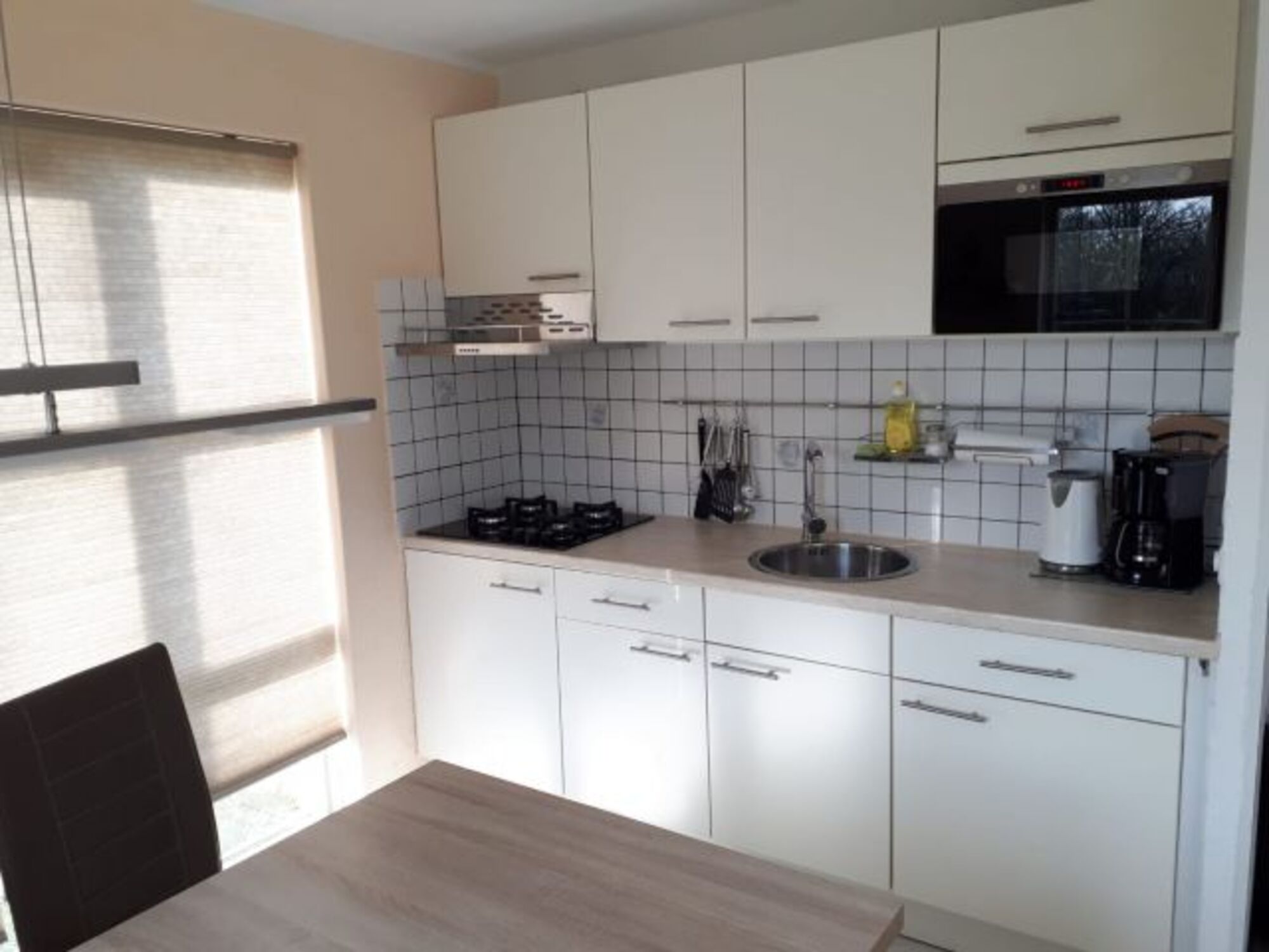 4-Platten Herd, Dunstabzugshaube, Kühlschrank mit Gefrierfach, Eierkocher, Elekt. Fruchtpresse, Waffeleisen, Korkenzieher / Flaschenöffner, Gewürze (Salz, Pfeffer, Zucker)