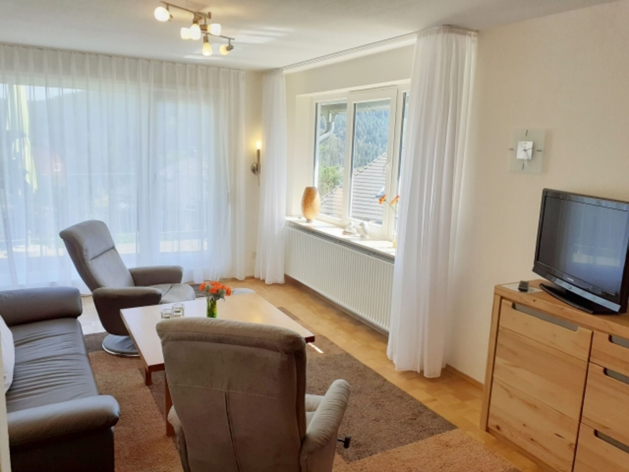Unsere Ferienwohnung "Bergblick II" verfügt über einen geräumigen Wohnraum mit separater Essecke, 2 Schlafzimmer (Doppelbetten; 1x auf Wunsch Einzelbetten). Kinder- oder Zustellbett zusätzlich möglich.