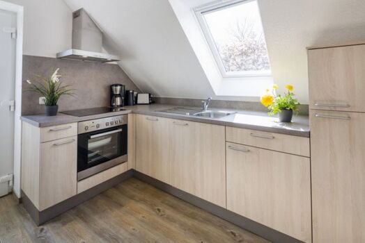 Cerankochfeld, Dunstabzugshaube, Kühlschrank mit Gefrierfach, Eierkocher, Korkenzieher / Flaschenöffner, Geschirrhandtücher, Mülltüten, Essplatz in der Küche