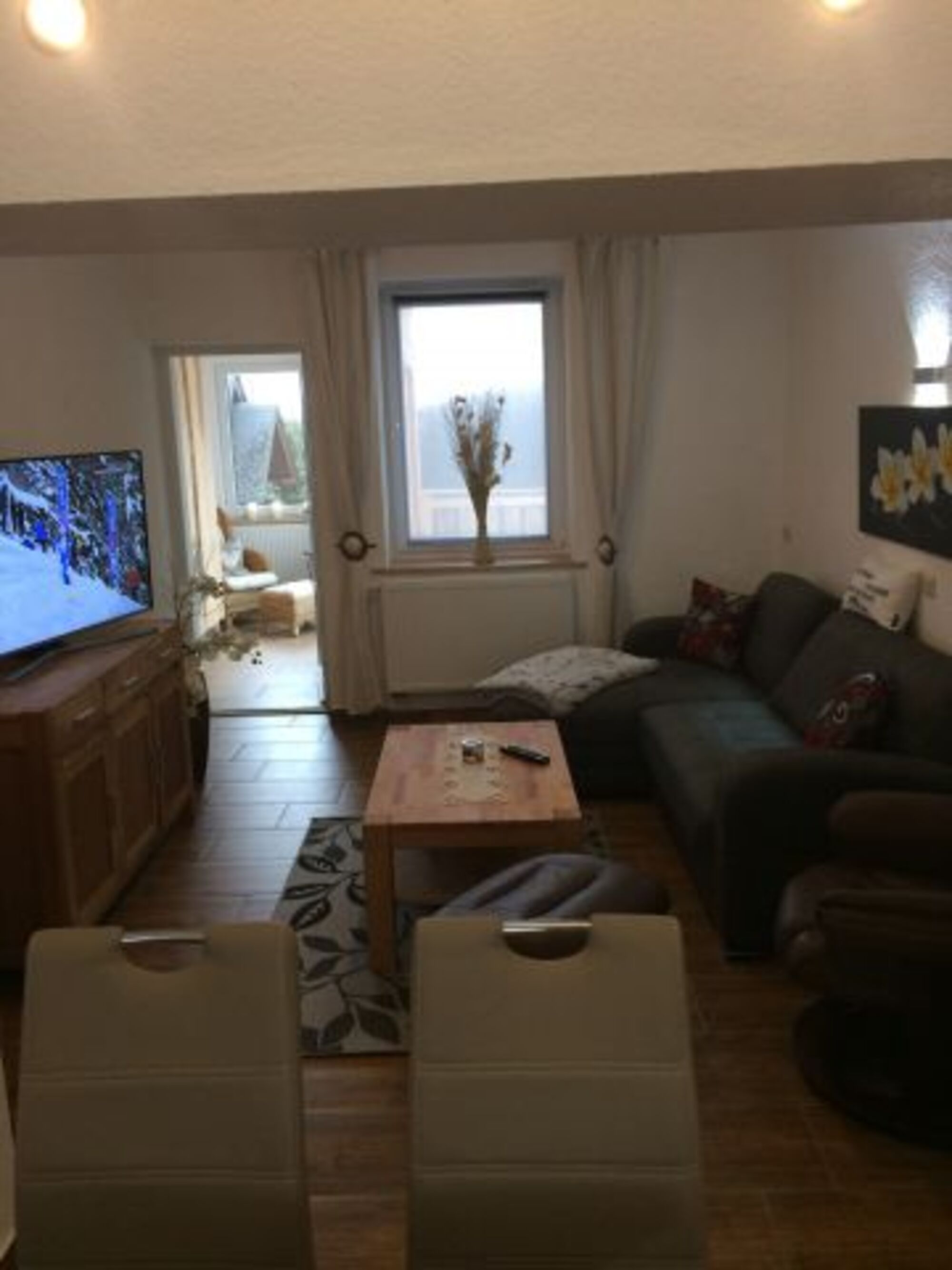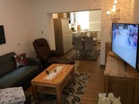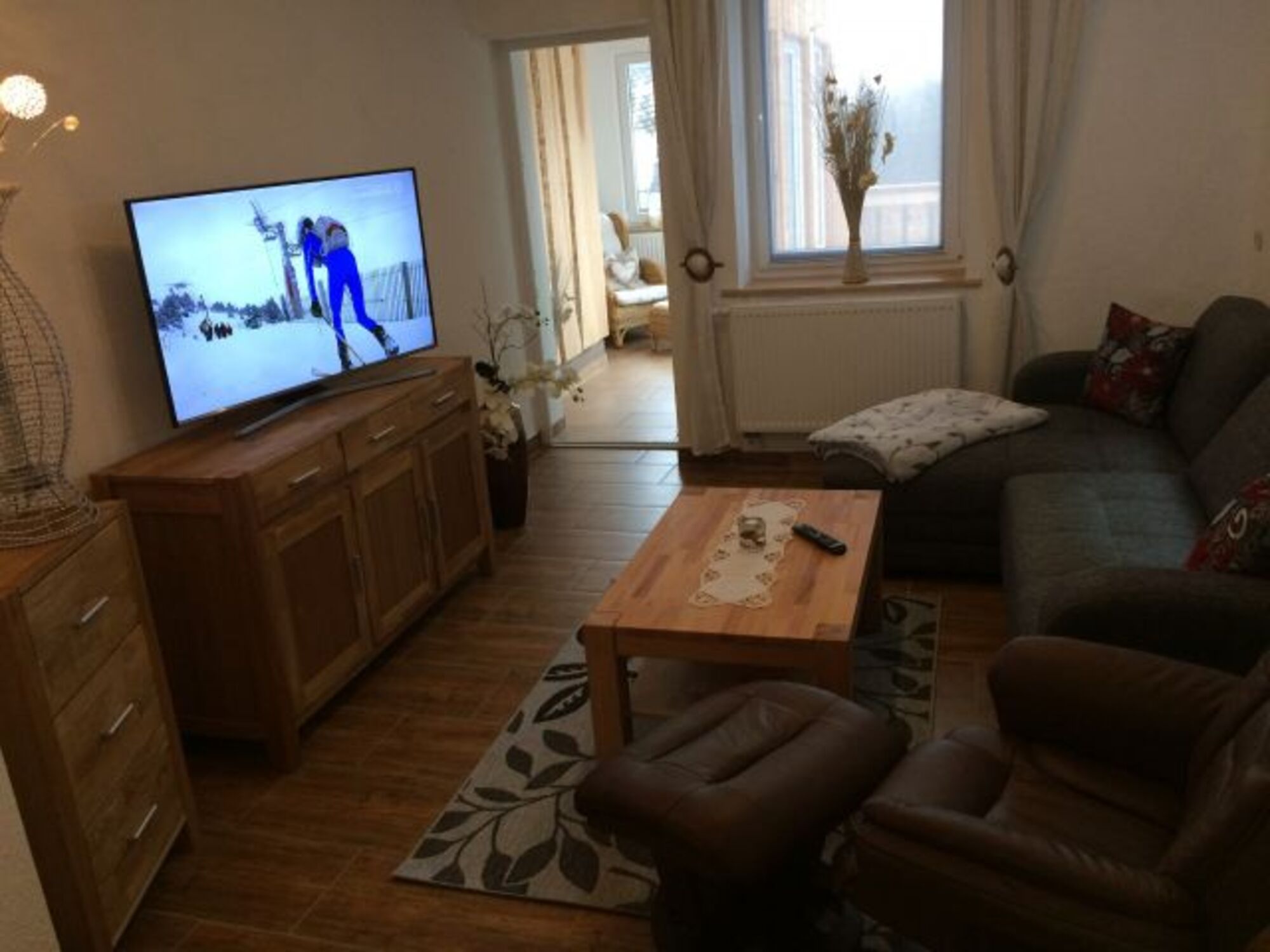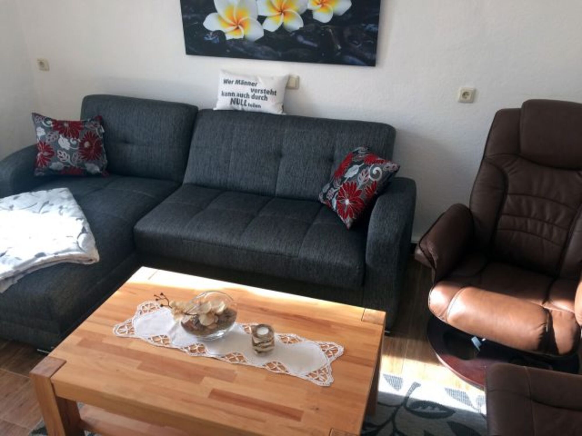 Der liebevoll eingerichtete Wohnbereich bietet Ihnen einen kuscheligen Lümmelsessel und ein gemütliches Sofa, welches sich schnell für zwei weitere Gäste aufbetten lässt, einen Couchtisch, einen Flachbild_Fernseher_SAT_ TV (55 Zoll ) mit Internetzugang -W LAN