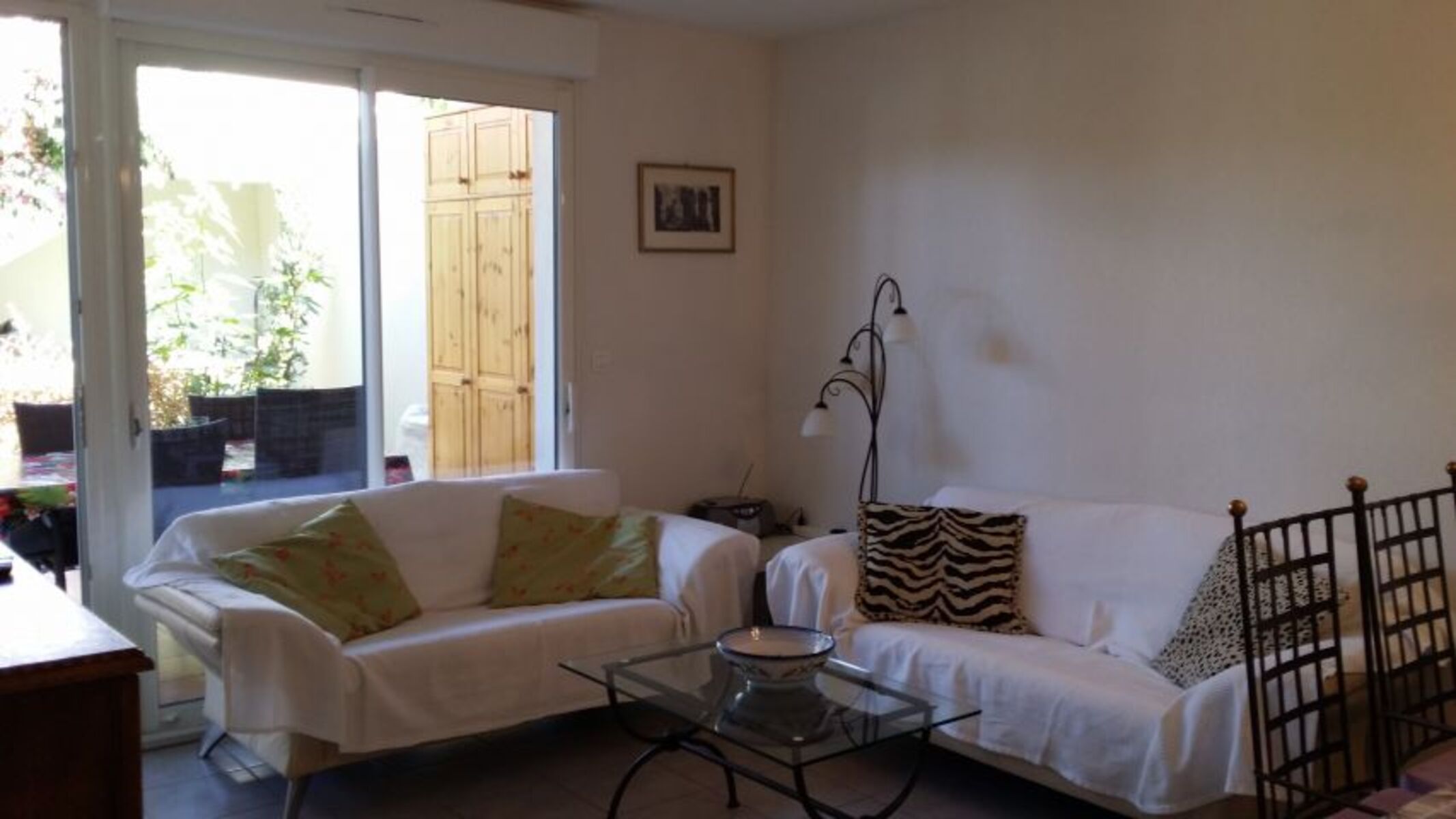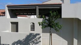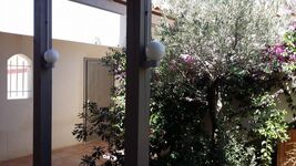 Ein imposanter Olivenbaum, buschig rankende Bougainvilleas, duftender Lavendel - mediterran und dicht begrünt zeigt sich der Innenhof des Hauses, dessen Vordach kühlenden Schatten spendet.