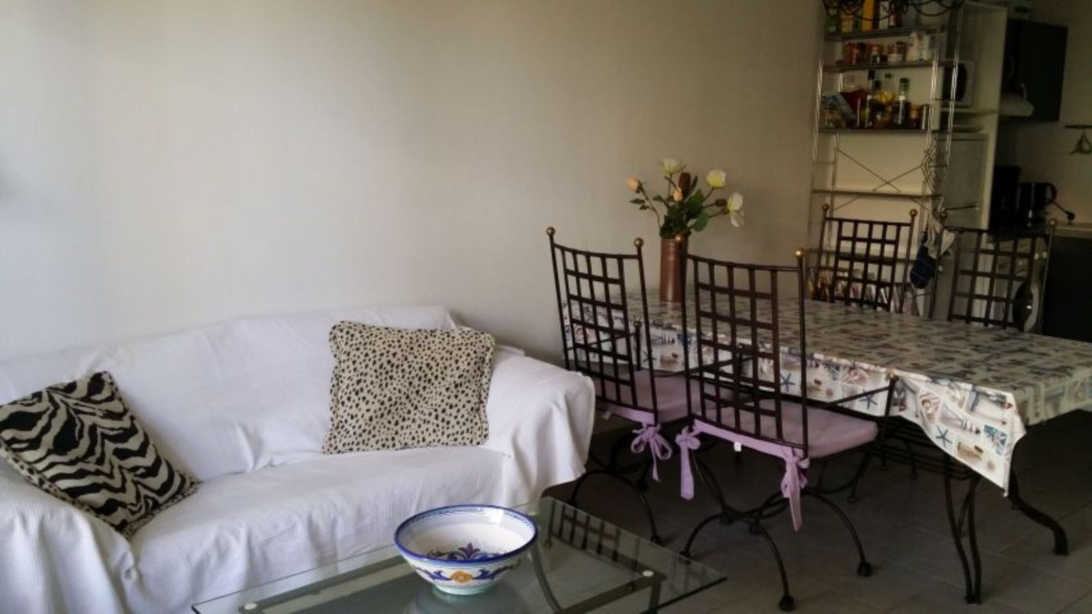 Die Klarheit des Raumes wird unterstrichen durch den eleganten Esstisch aus Glas und die mit Polstern belegten Stühle aus dunklem Eisen.