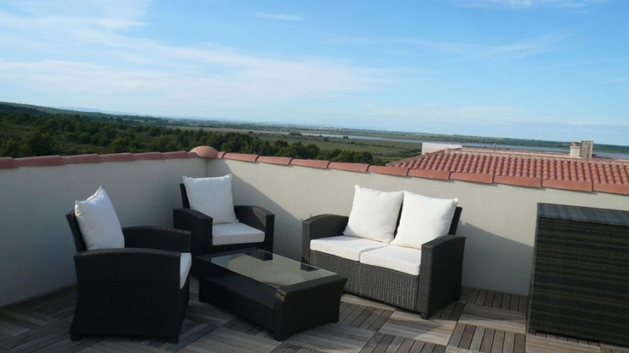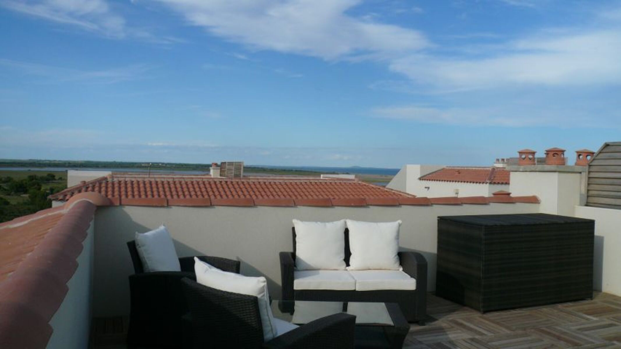 Ganztägig sonnenbeschienen ist die Dachterrasse, die Sonnenliegen und eine bequeme Sitzgruppe bereithält, und die mit einem wunderschönen Meerblick überrascht.