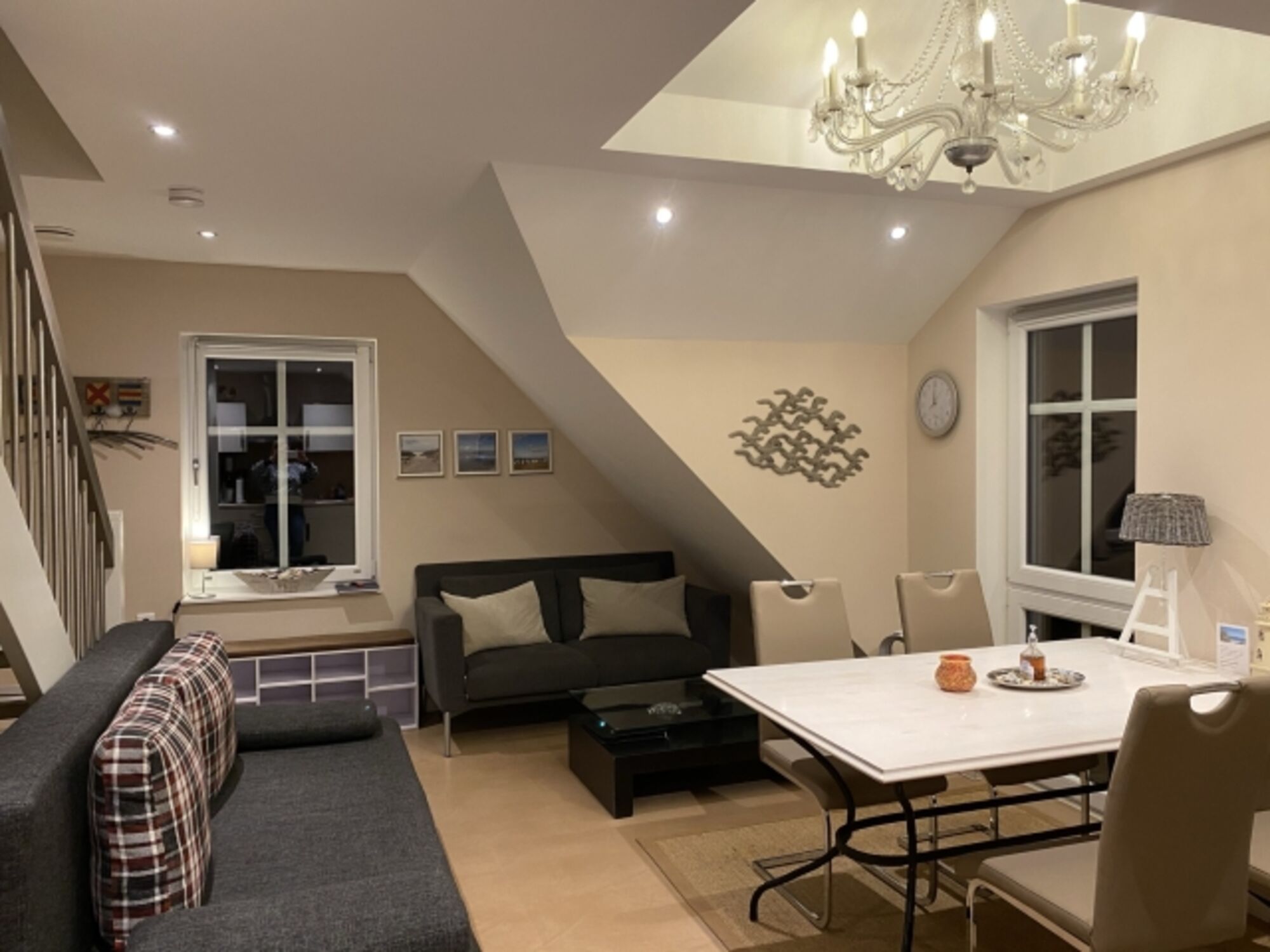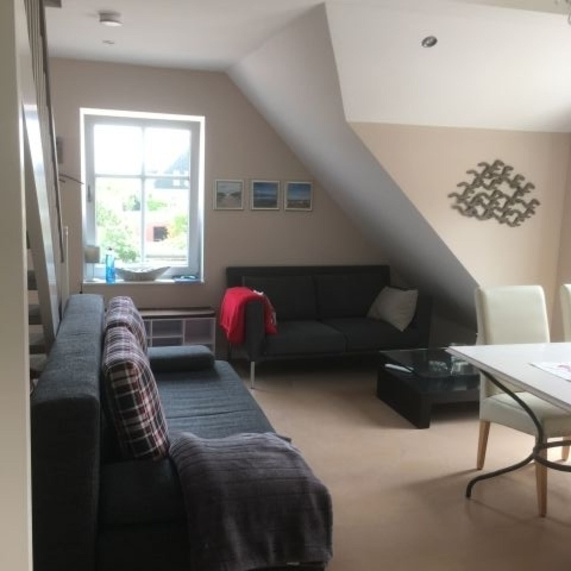 Sie wohnen in einer ca. 40m² Maisonnettewohnung im Obergeschoss des Hauses. Auf der unteren Ebene ist der offene Küchen- und Wohnbereich mit Geschirrspülmaschine, HD-Fernsehen und kostenlosem Wlan. Im Dachgeschoss befinden sich ein Schlafzimmer mit Doppelbett, ein Duschbad und ein Doppelstockbett. Vom Schlafzimmer aus haben Sie aus dem Cabriofenster einen Rundummeerblick.