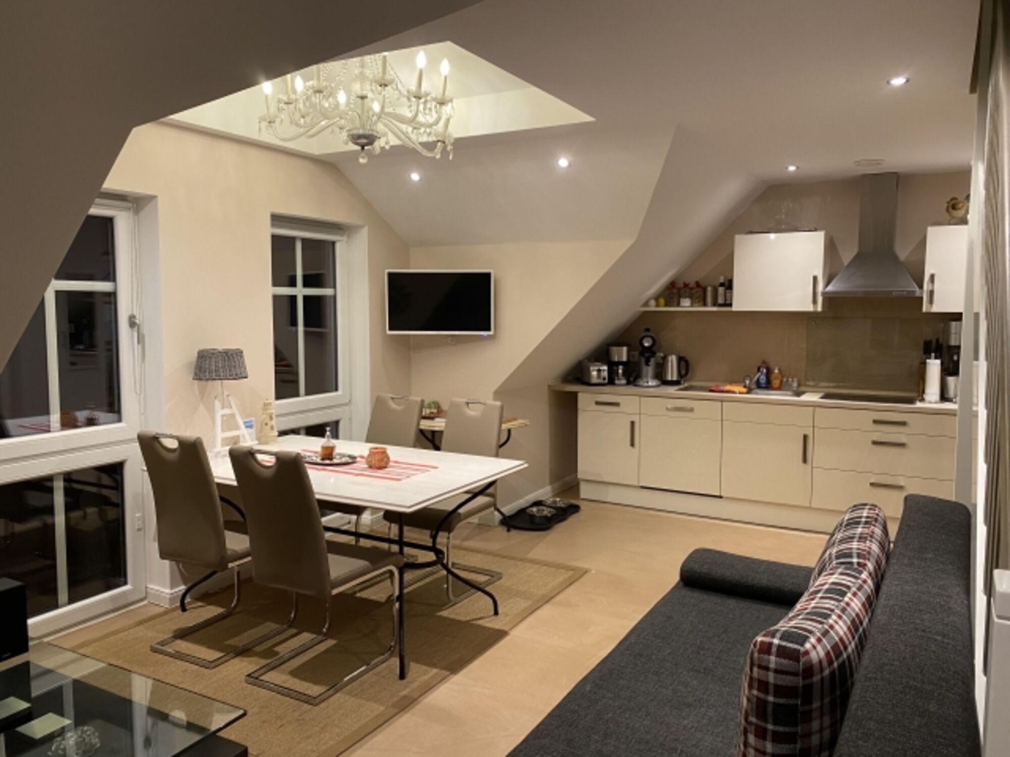 Cerankochfeld, Dunstabzugshaube, Kühlschrank mit Gefrierfach, Senseo-Kaffeeautomat, Eierkocher, Mixer, Elekt. Fruchtpresse, Korkenzieher / Flaschenöffner, Gewürze (Salz, Pfeffer, Zucker), Öl / Essig, Geschirrhandtücher, TV in der Küche