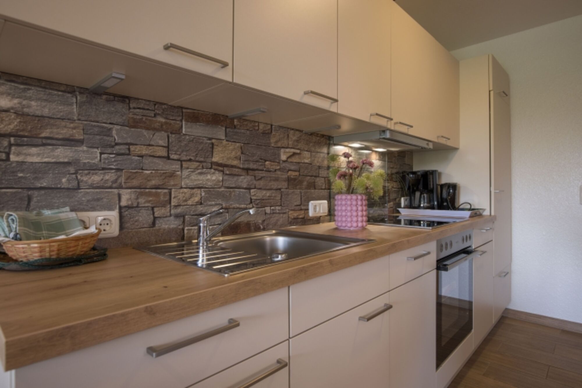 4-Platten Herd, Dunstabzugshaube, Kühlschrank mit Gefrierfach, Eierkocher, Korkenzieher / Flaschenöffner, Geschirrhandtücher, Essplatz in der Küche