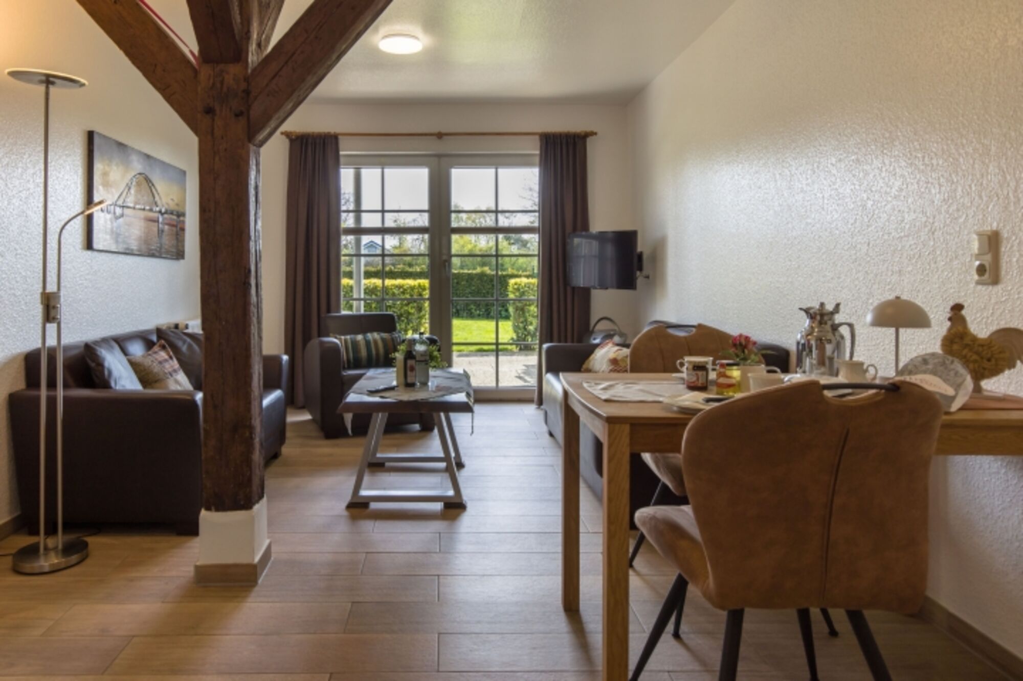 Diese Wohnung macht mehr als alle anderen im alten Speicher deutlich, dass man sich hier in einem Gebäude befindet, das von alter Zimmermannskunst geprägt ist. Das dokumentiert allein die dominant im Wohnraum stehende Holzkonstruktion, die einen massiven Holzständer mit einem mächtigen Querträger verbindet.