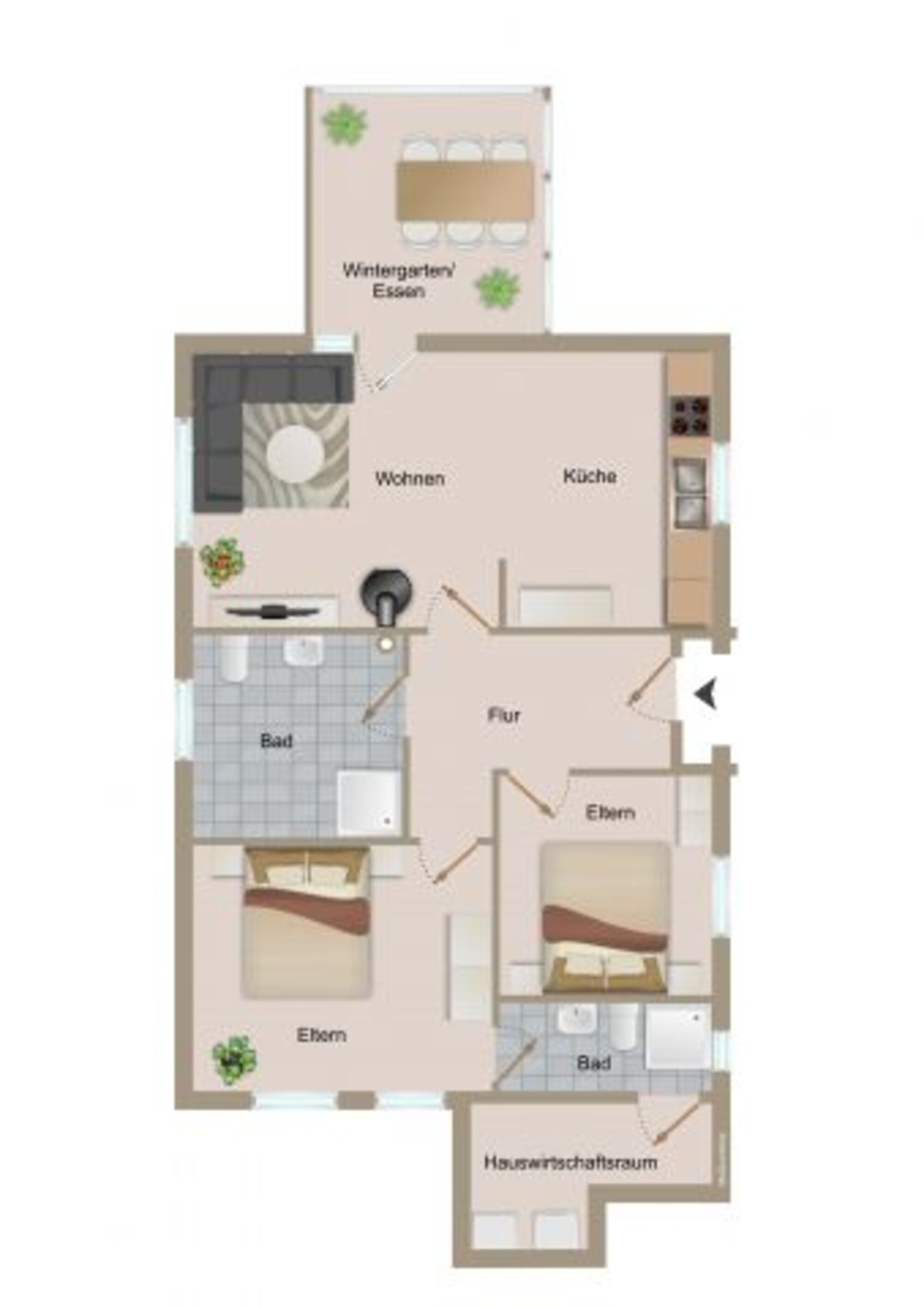 Durch die Terrassentür können Sie den Wintergarten zum sonnigen Grundstück hin öffnen. Die hier liegende Terrasse bietet sich, da von morgens bis abends von der Sonne geküsst, als Frühstücksplätzchen genauso wie zum abendlichen Grillen an.
