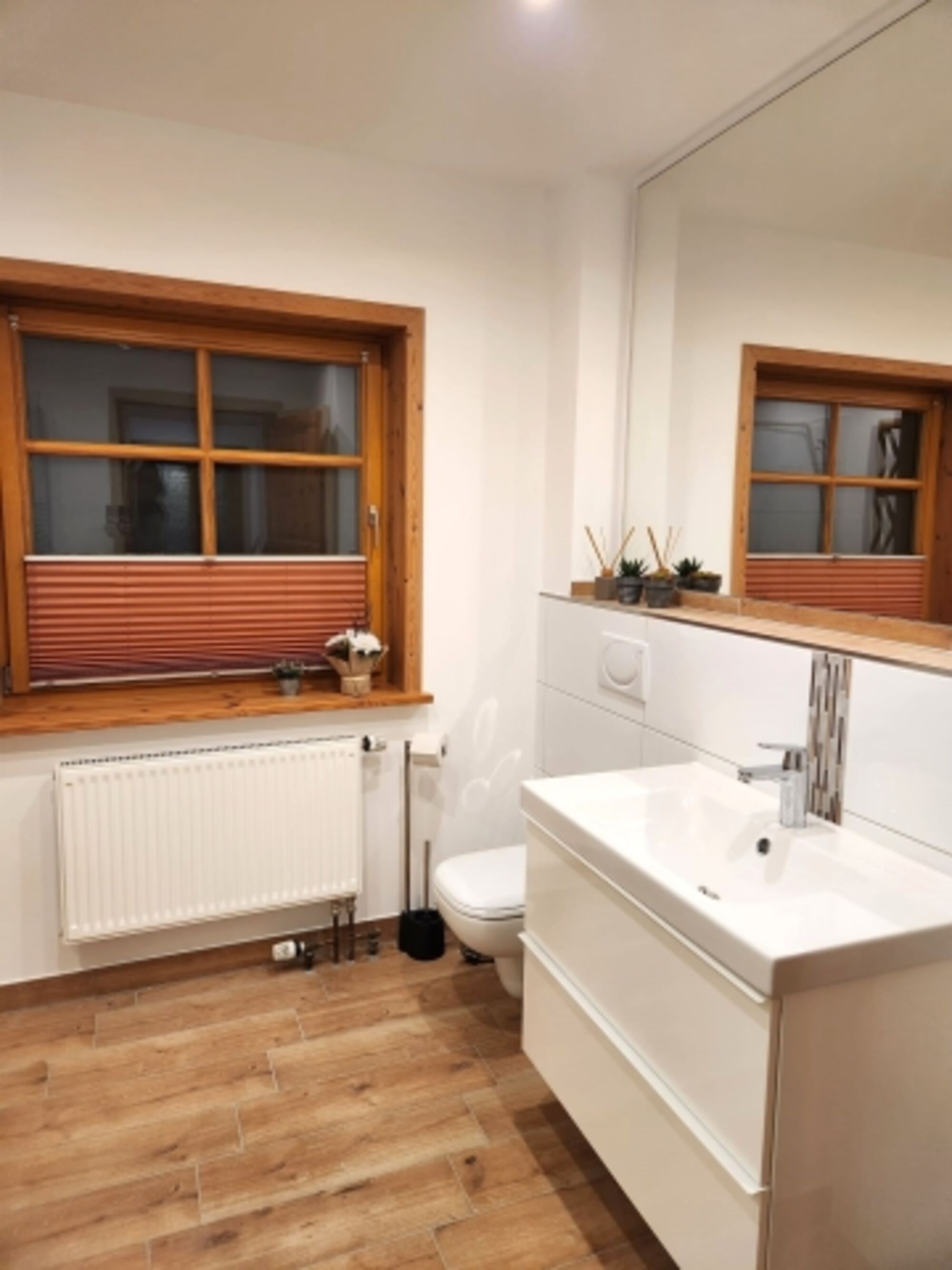 Waschbecken, Regendusche, Spiegel, Fenster im Bad