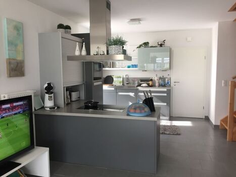 Cerankochfeld, Induktionsherd, Dunstabzugshaube, Kühlschrank mit Gefrierfach, Kaffeevollautomat, Eierkocher, Mixer, Korkenzieher / Flaschenöffner, Gewürze (Salz, Pfeffer, Zucker), Mülltüten, Essplatz in der Küche