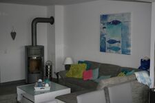 TV, TV-Sat, HDTV Flachbildschirm, Blu-Ray-Player, DVD bzw. Blu-Ray-Filme, Bücher, Kaminofen, Eckcouch, Sessel