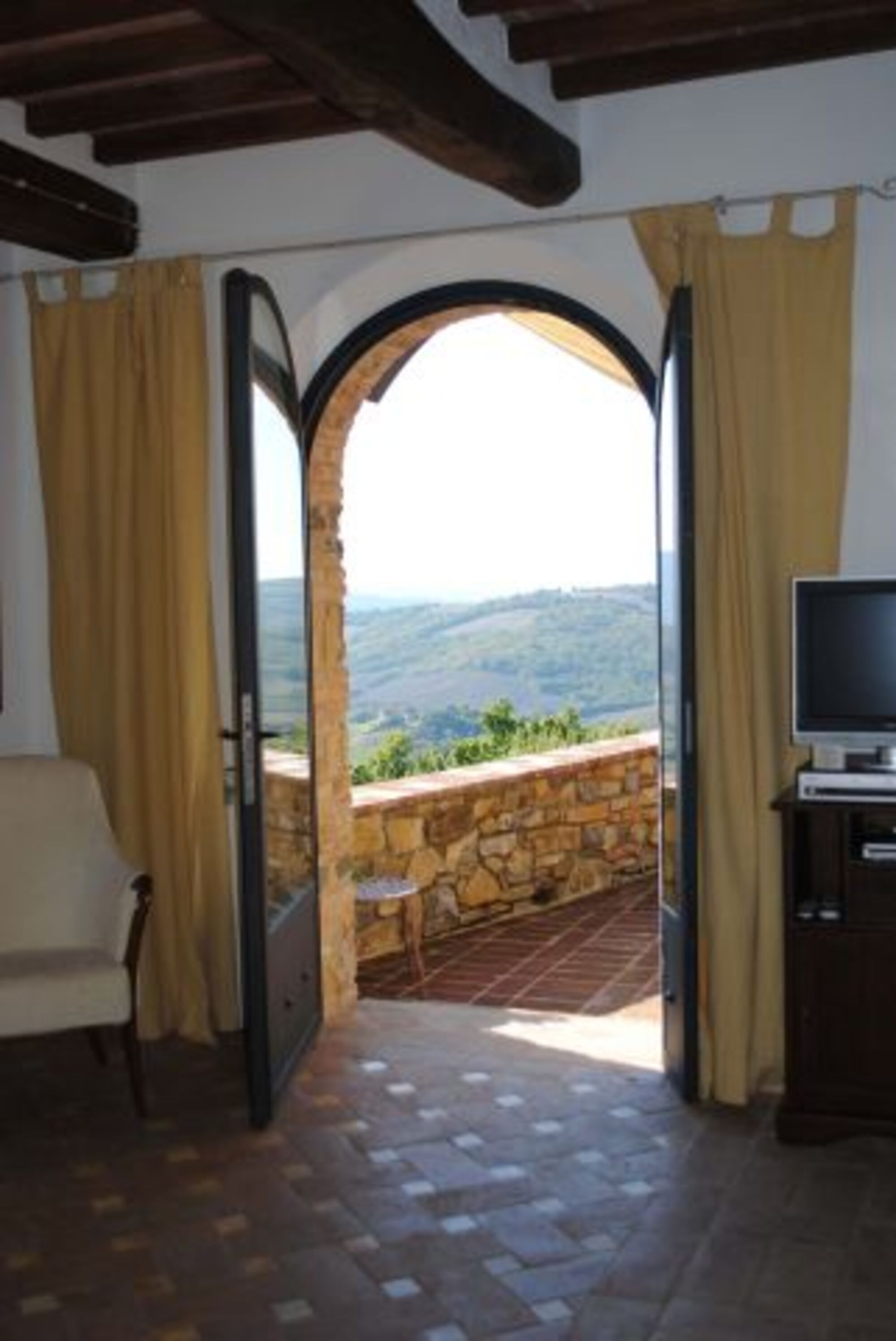 Das Appartement Bacchus (56,5 m²) befindet sich in Süd-West Lage (Sonnenuntergangsseite) mit wunderschöner Aussicht auf Radicondoli und der umgebenden Hügellandschaft.