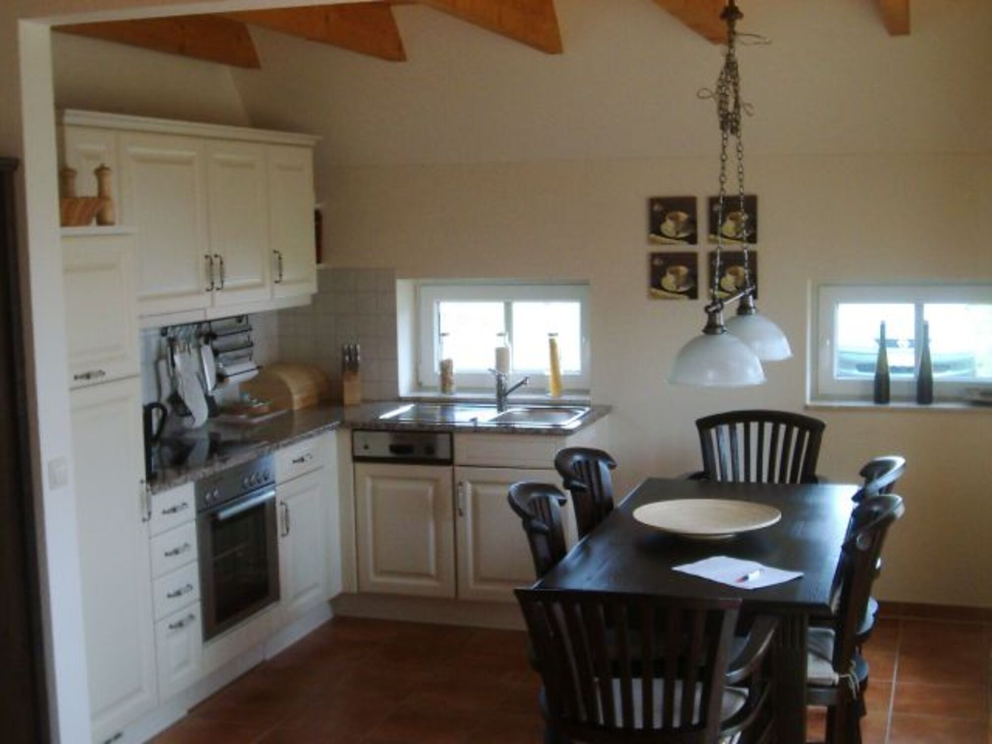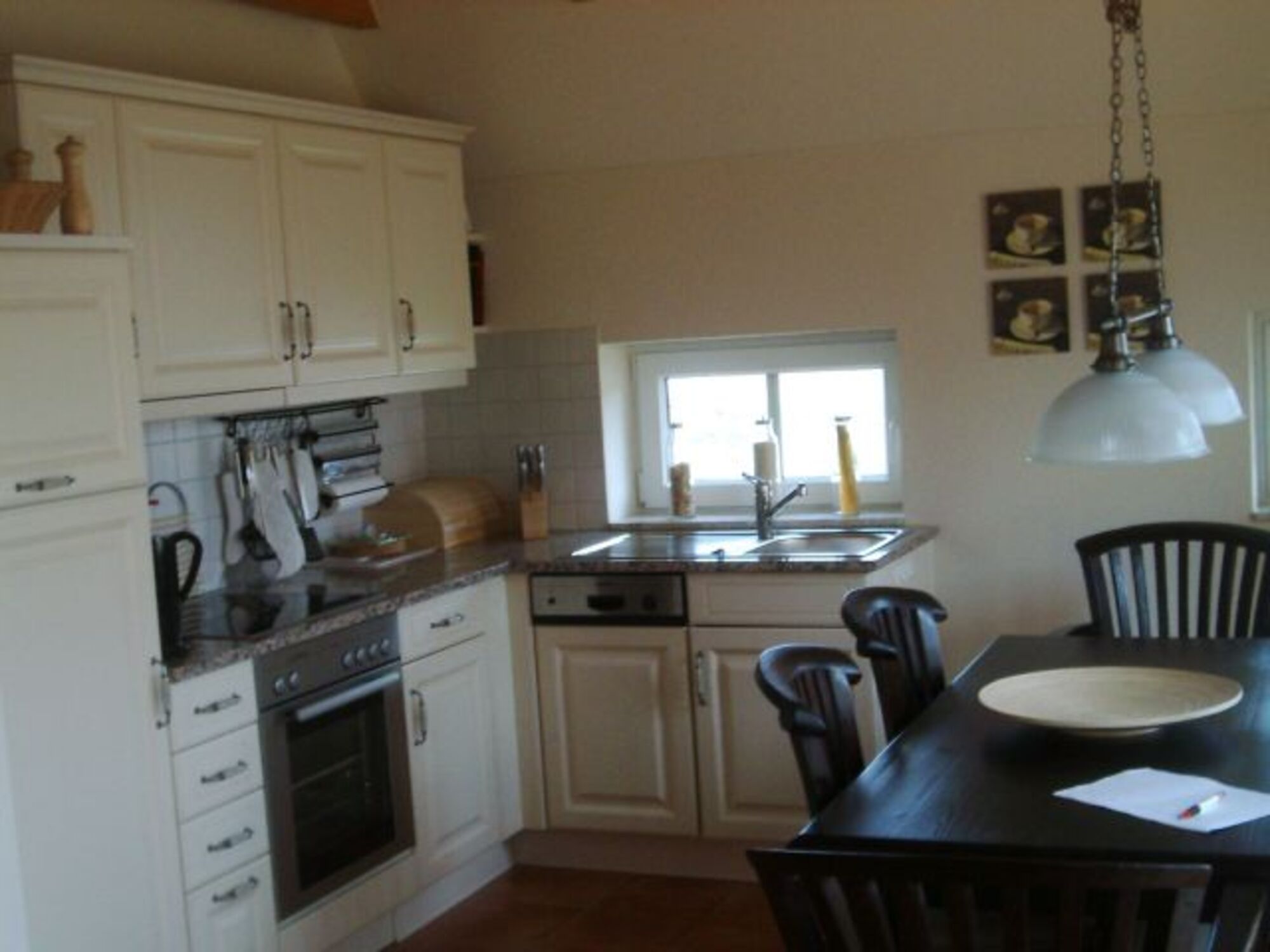 Cerankochfeld, Dunstabzugshaube, Kühlschrank mit Gefrierfach, Eierkocher, Korkenzieher / Flaschenöffner, Gewürze (Salz, Pfeffer, Zucker), Mülltüten, Essplatz in der Küche