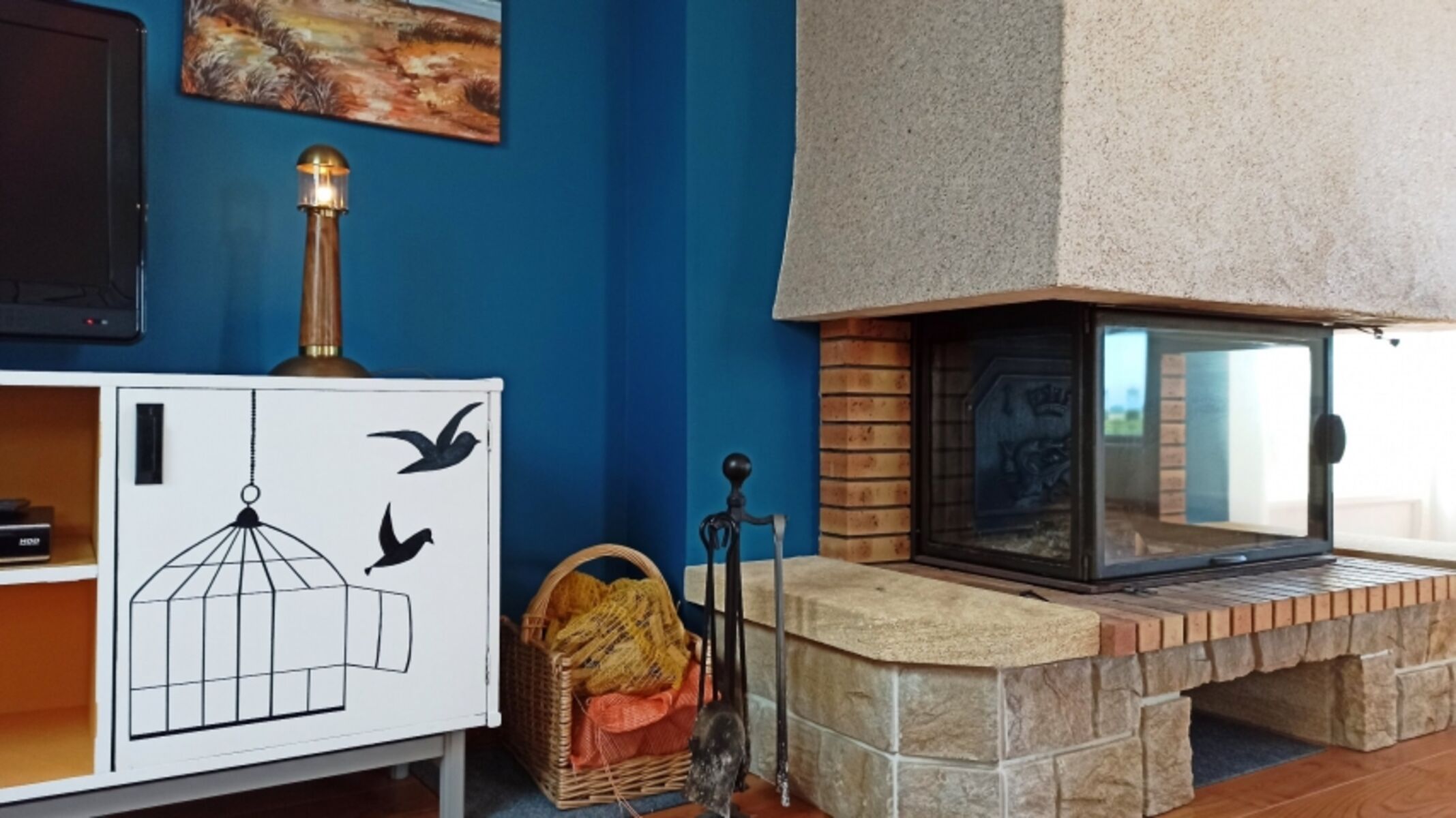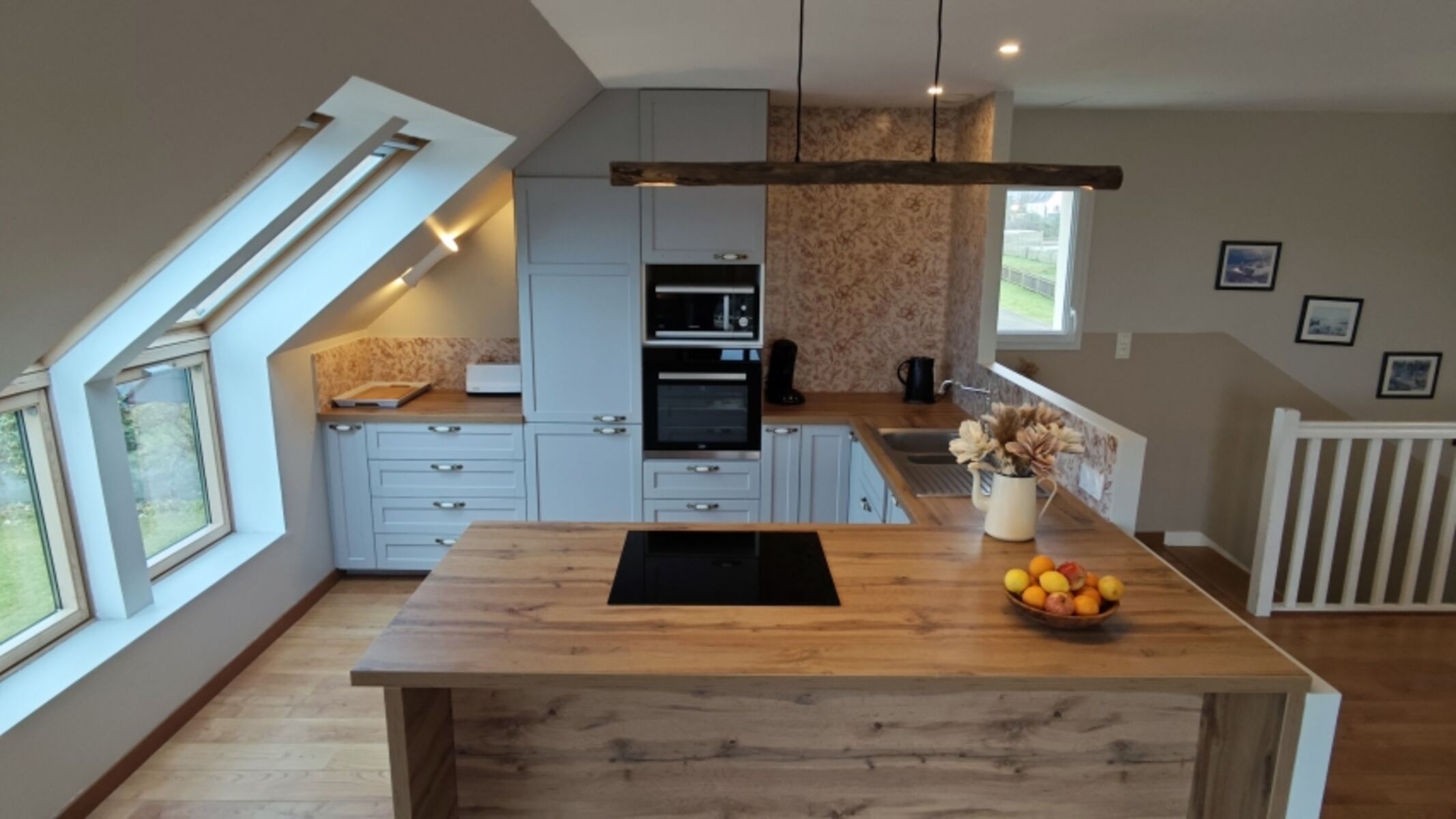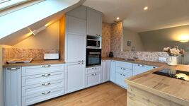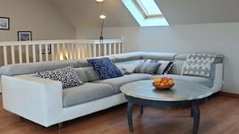 Im Obergeschoss befindet sich das Wohnzimmer mit Essbereich, Kamin, SAT-TV mit deutschen Sendern, DVD und voll ausgestatteter Küche (Spülmaschine, Cerankochfeld, Herd, Mikrowelle, Kühlschrank, Filter-Kaffeemaschine, Senseo-Kaffeemaschine, Wasserkocher und Toaster) sowie die Süd-Terrasse mit wunderbarem Meeresblick.