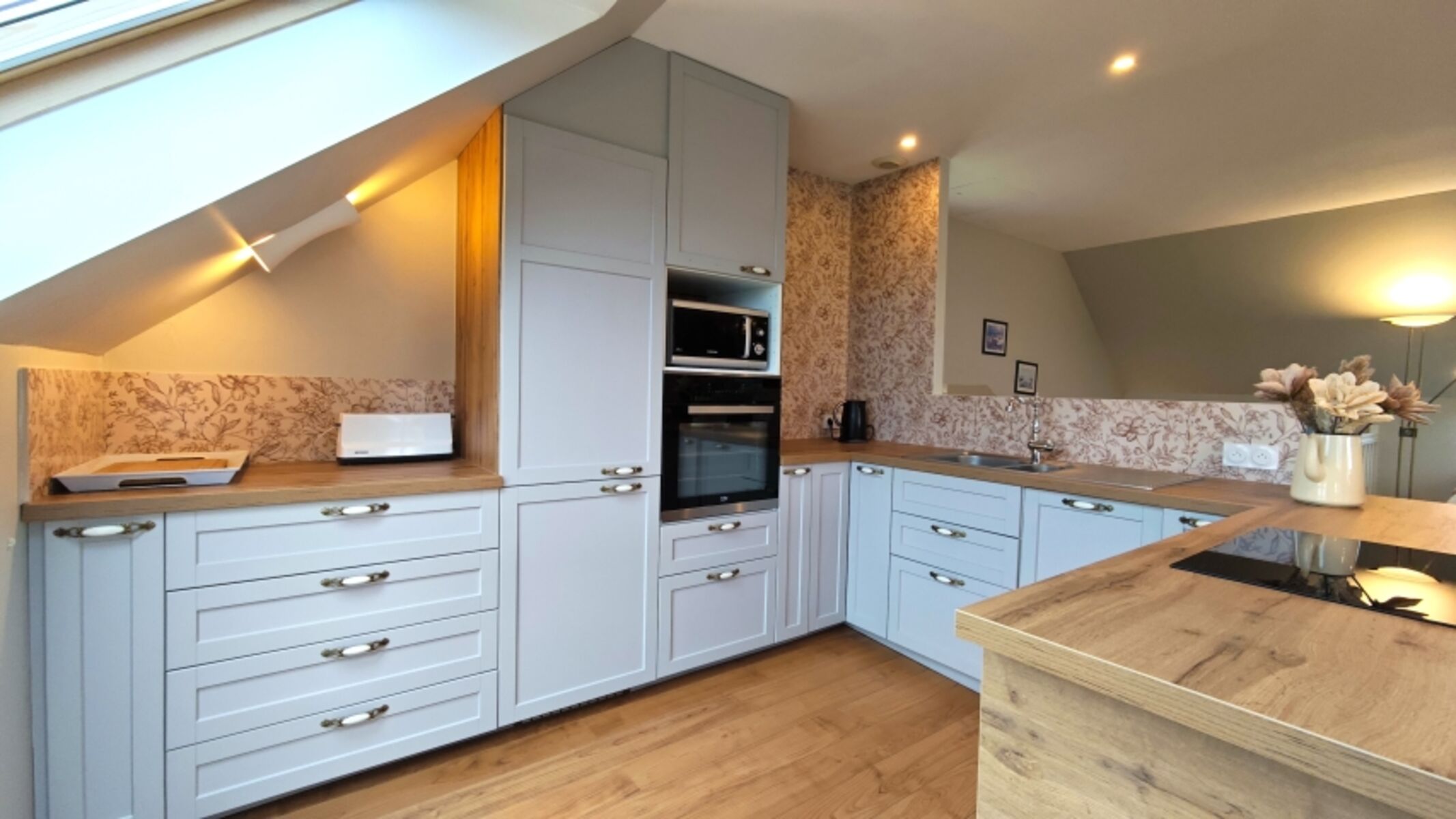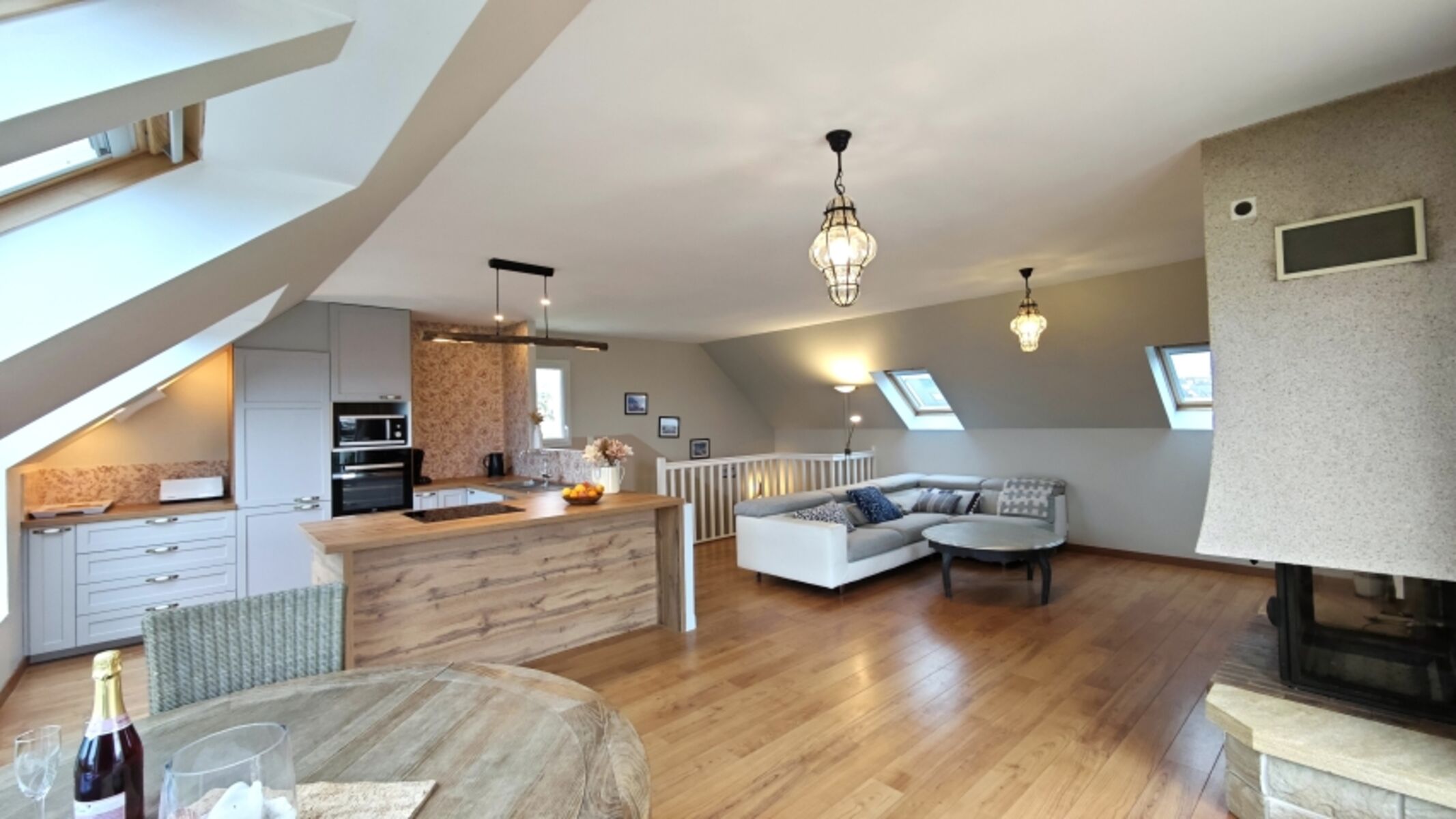 Induktionsherd, Kühlschrank mit Gefrierfach, Gefrierschrank, Senseo-Kaffeeautomat, Korkenzieher / Flaschenöffner, Gewürze (Salz, Pfeffer, Zucker), Öl / Essig, Geschirrhandtücher, Mülltüten