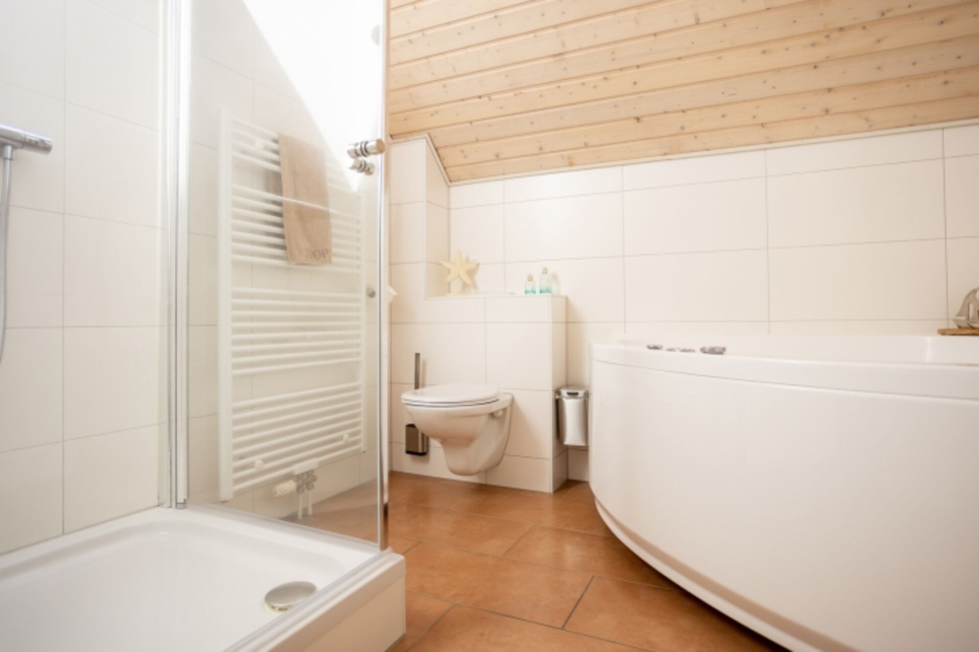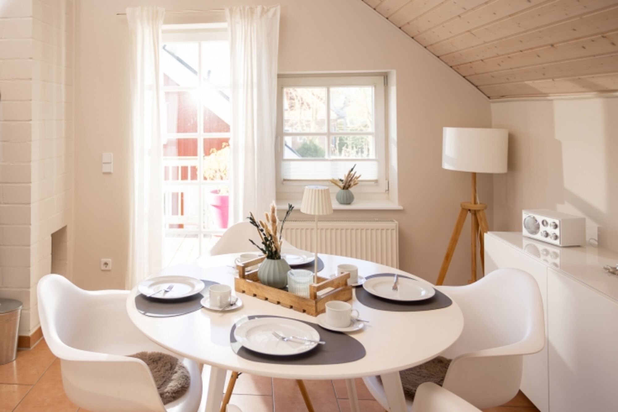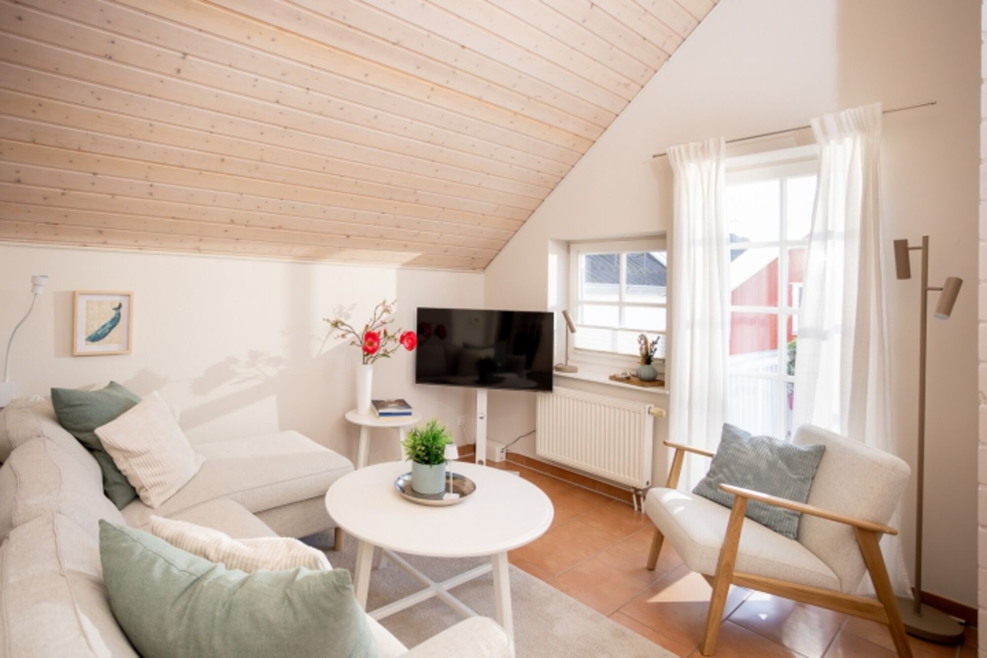 Die Wohnung erstreckt sich über offene, bis in den Giebel reichende Räume und ist ideal für entspannte Tage – ob beim Kuscheln auf dem Sofa, beim Baden im Whirlpool oder beim Spaziergang entlang des nur 300 Meter entfernten Hafens. Auch Ihr vierbeiniger Freund ist bei uns herzlich willkommen und findet in Greetsiel viele schöne Wege zum Schnüffeln, Spazieren und Entdecken.