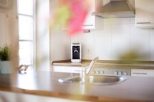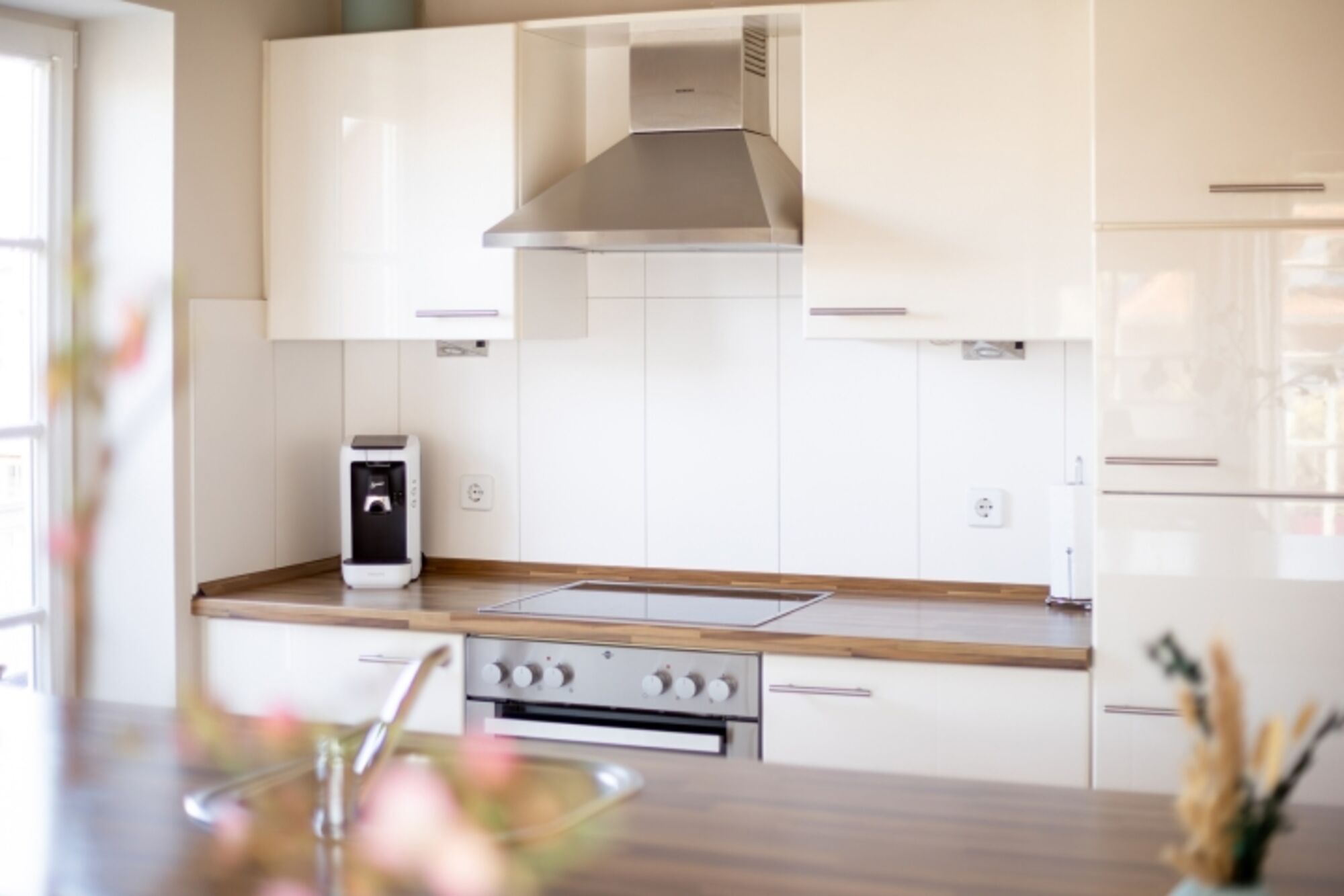Cerankochfeld, Dunstabzugshaube, Kühlschrank mit Gefrierfach, Senseo-Kaffeeautomat, Eierkocher, Korkenzieher / Flaschenöffner, Gewürze (Salz, Pfeffer, Zucker), Essplatz in der Küche, TV in der Küche