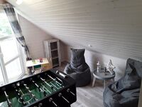 Im Obergeschoss unserer Windrose II erwartet Sie im Freizeitzimmer Spiel, Spaß und Action. Scheint einmal nicht die Sonne? Kicker und diverse Spiele sorgen für Abwechslung. Ein zweiter Fernseher darf hier natürlich auch nicht fehlen. Oder Sie öffnen die Balkontür, nehmen Platz und genießen die herrliche Seeluft. Sehr entspannende Momente, besonders in der kalten Jahreszeit, bietet die im Obergeschoß gelegene Sauna.