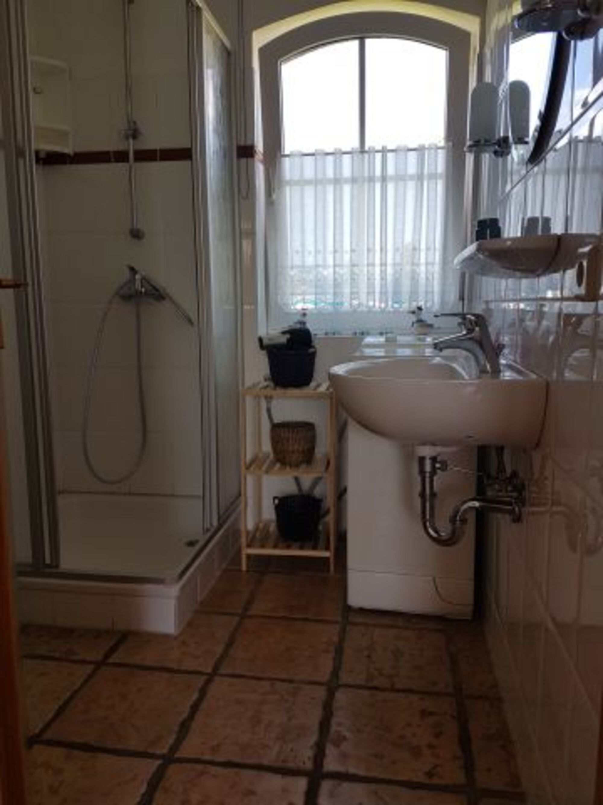 4 Handtücher pro Person auf Anfrage und gegen eine Gebühr von 8,00 Euro / Person. Waschbecken, Spiegel, Fenster im Bad