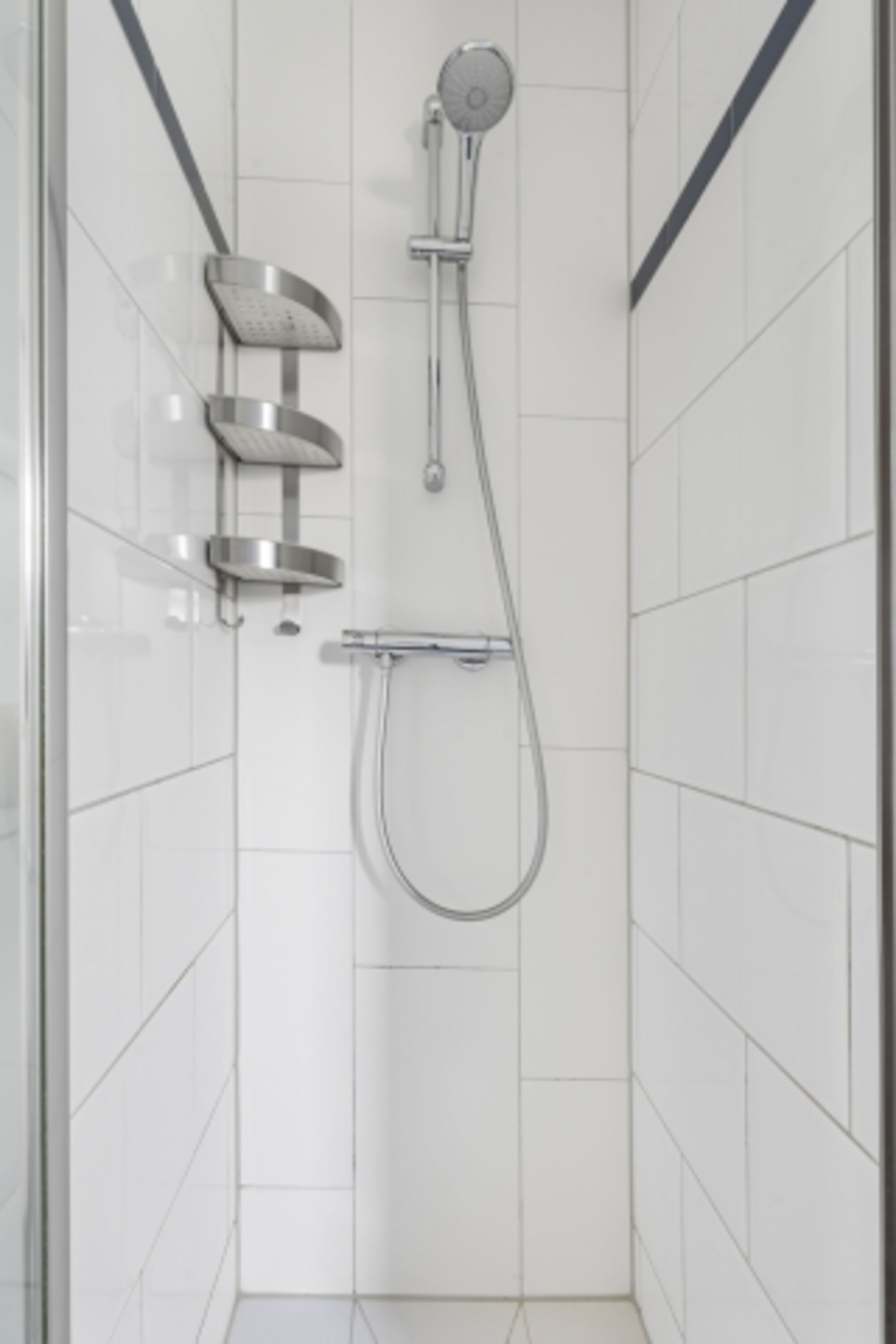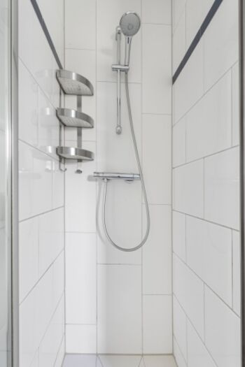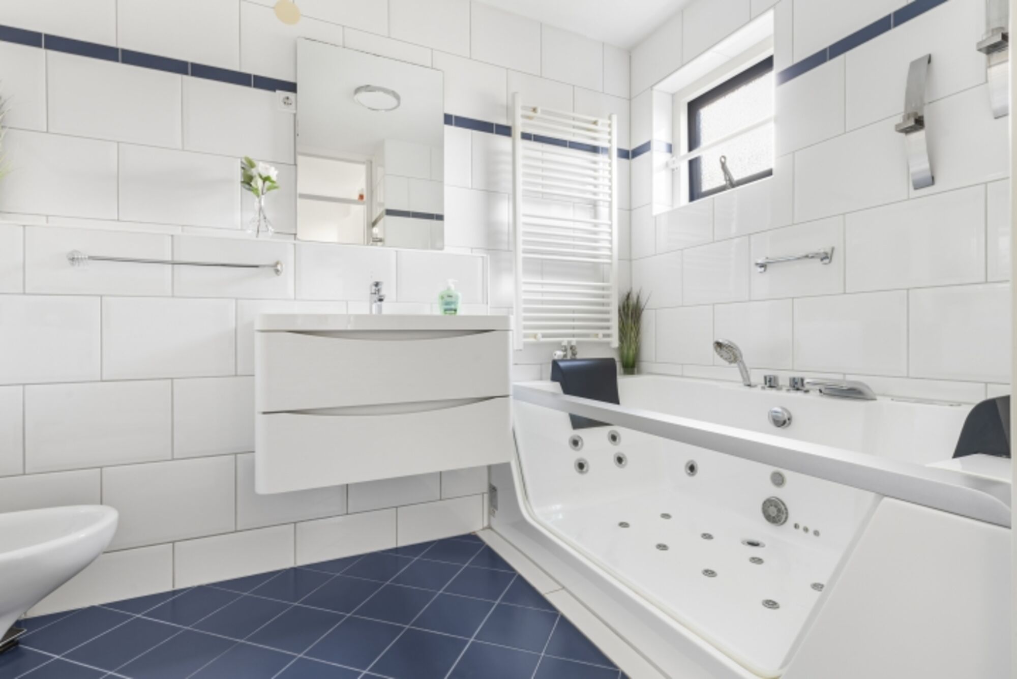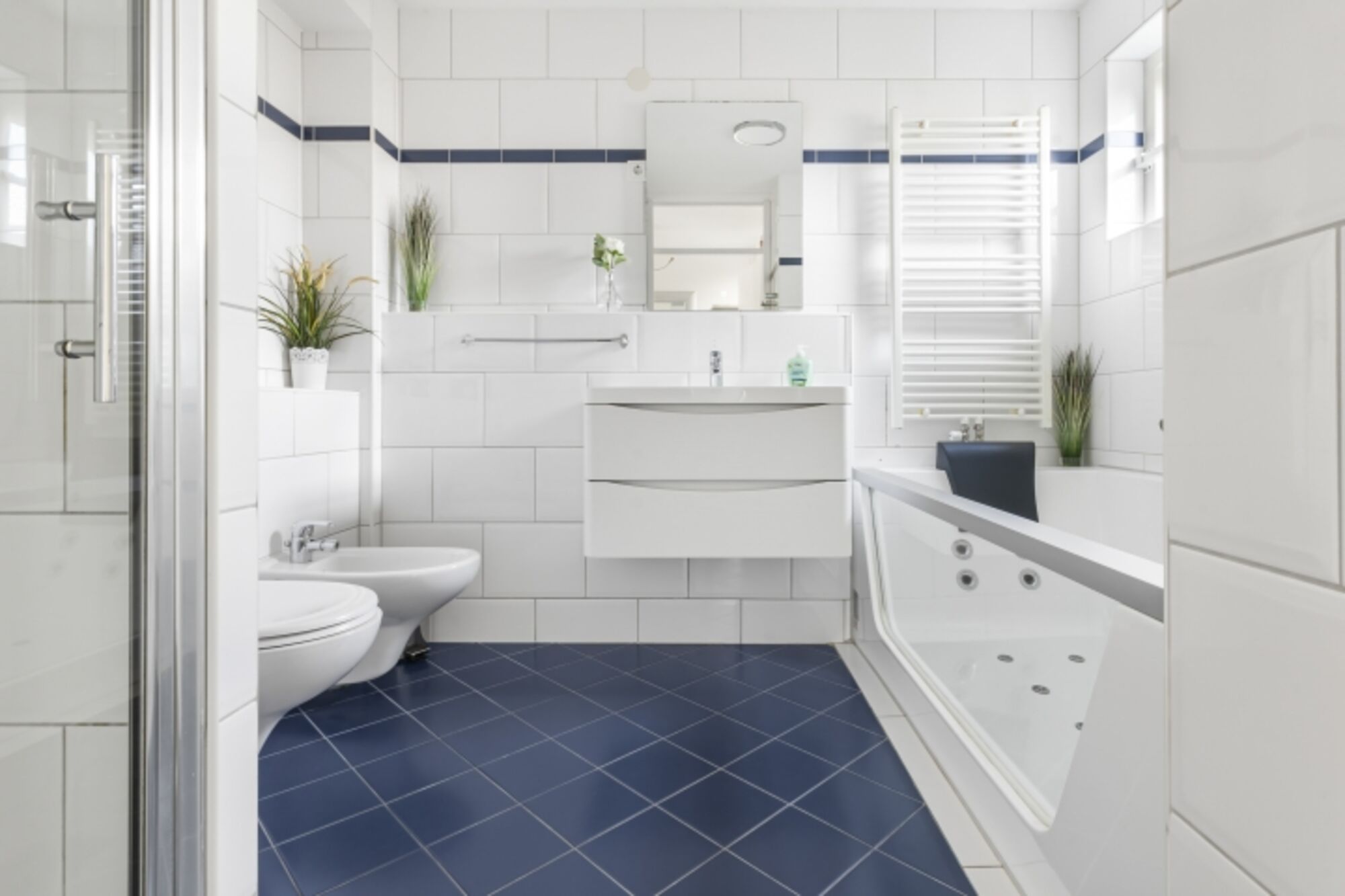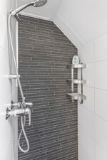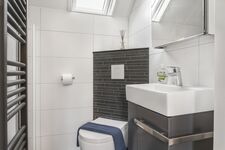 Ein Badezimmer im EG mit gläserner Badewanne für 2 Personen und separater barrierefreier Dusche sowie WC und BD, weiteres Duschbad mit WC sowie die Familiensauna im OG.