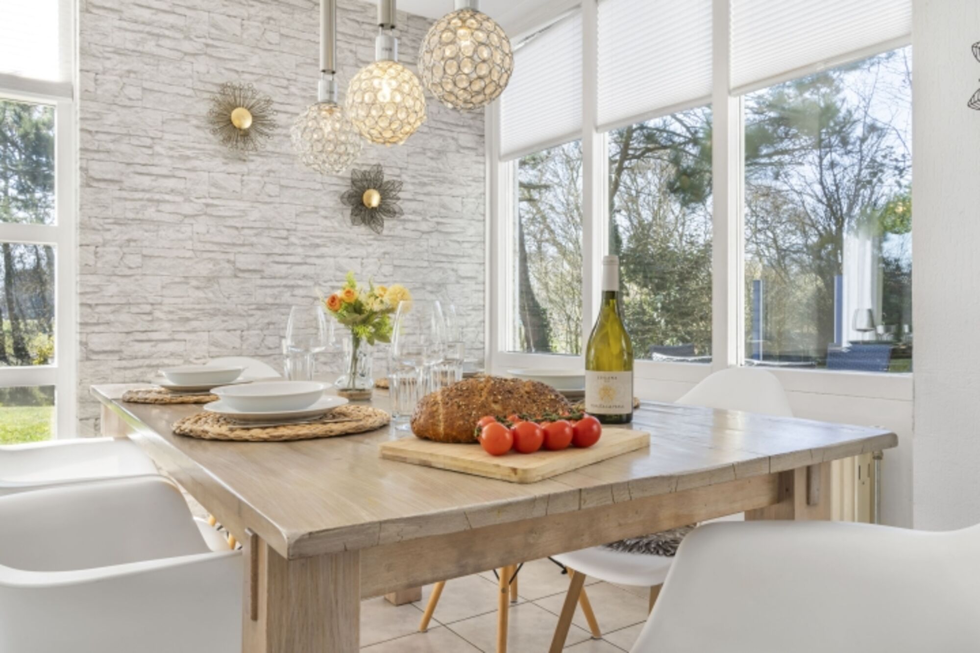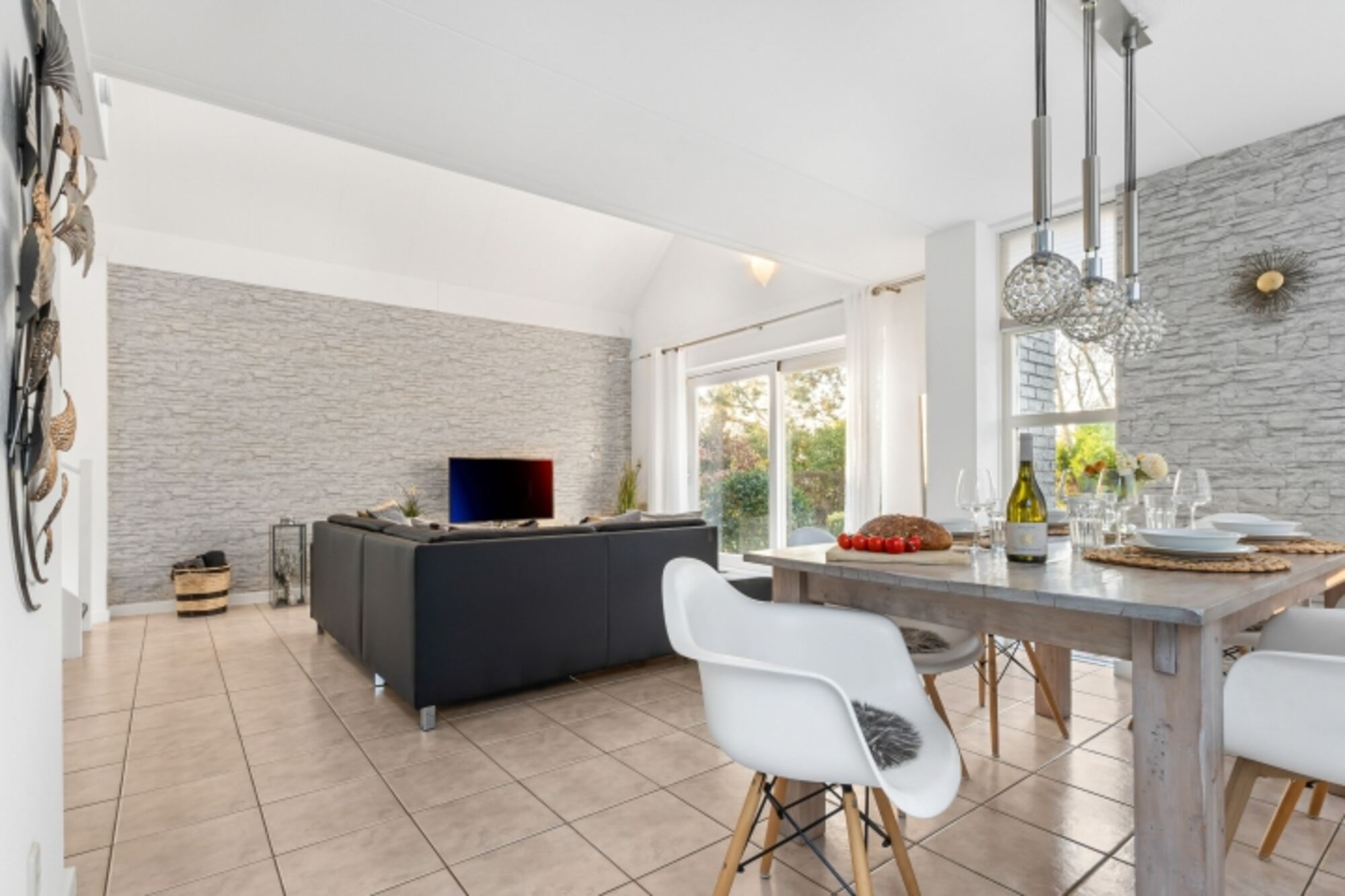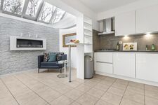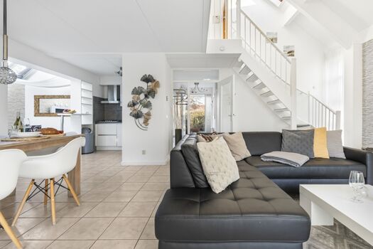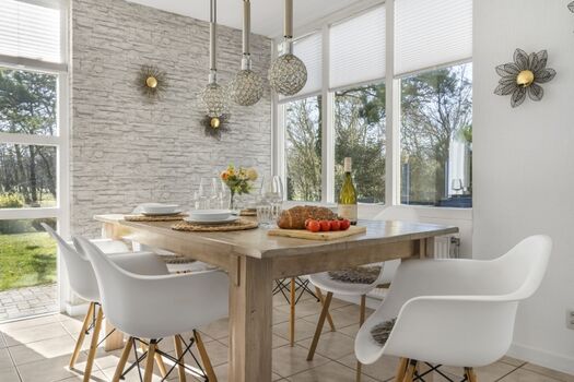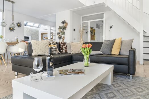 Wohnbereich mit Kamin, bequeme Wohnzimmergarnitur, Esstisch für 6 Personen, Leseecke im Wintergarten, XL-Flachbildschirm-TV (Sat-TV mit deutschen und internationalen Sendern, kein niederländisches TV), DVD, Radio mit CD/MP3 und Anschluss für Handy etc., kleine DVD-Sammlung, kleine Bibliothek, kostenloses WLAN.