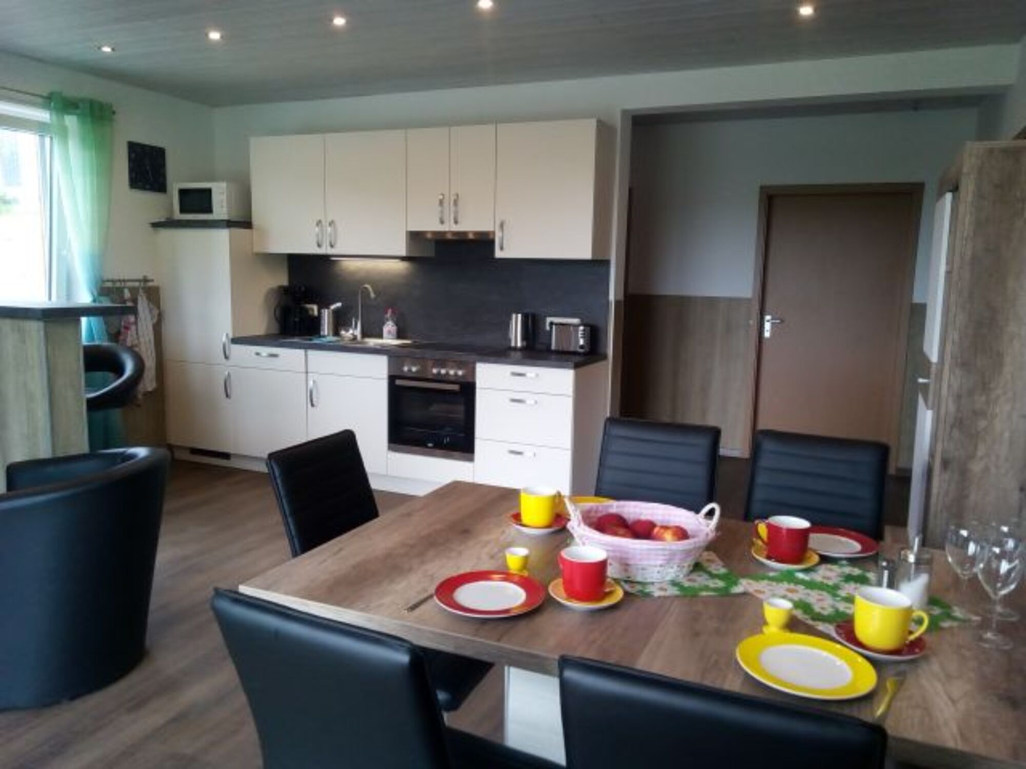 Cerankochfeld, Dunstabzugshaube, Kühlschrank mit Gefrierfach, Eierkocher, Küchenmaschine, Mixer, Korkenzieher / Flaschenöffner, Gewürze (Salz, Pfeffer, Zucker), Öl / Essig, Geschirrhandtücher, Mülltüten, Essplatz in der Küche