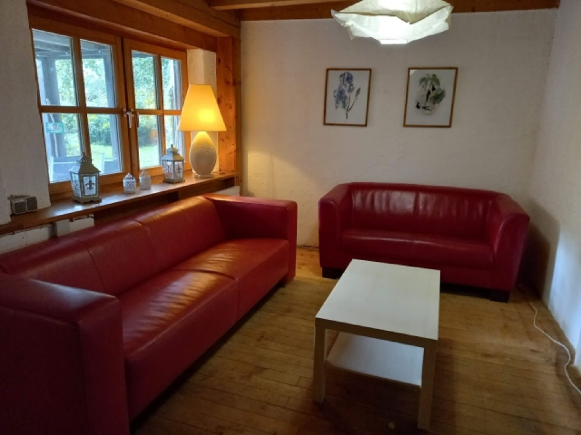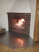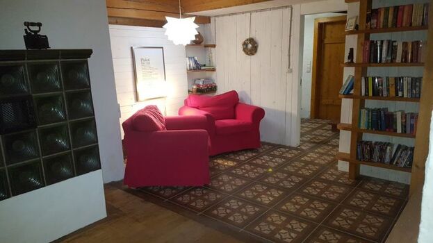 TV, TV-Sat, TV-Flachbildschirm, DVD-Player, DVD bzw. Blu-Ray-Filme, CD-Player, Bücher, Offener Kamin, Kaminofen, Kachelofen, 3er-Sofa, Sessel
