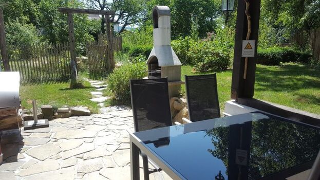 Liegewiese, Gartenmöbel, Holzgrill, Überdachte Terrasse (mobil)