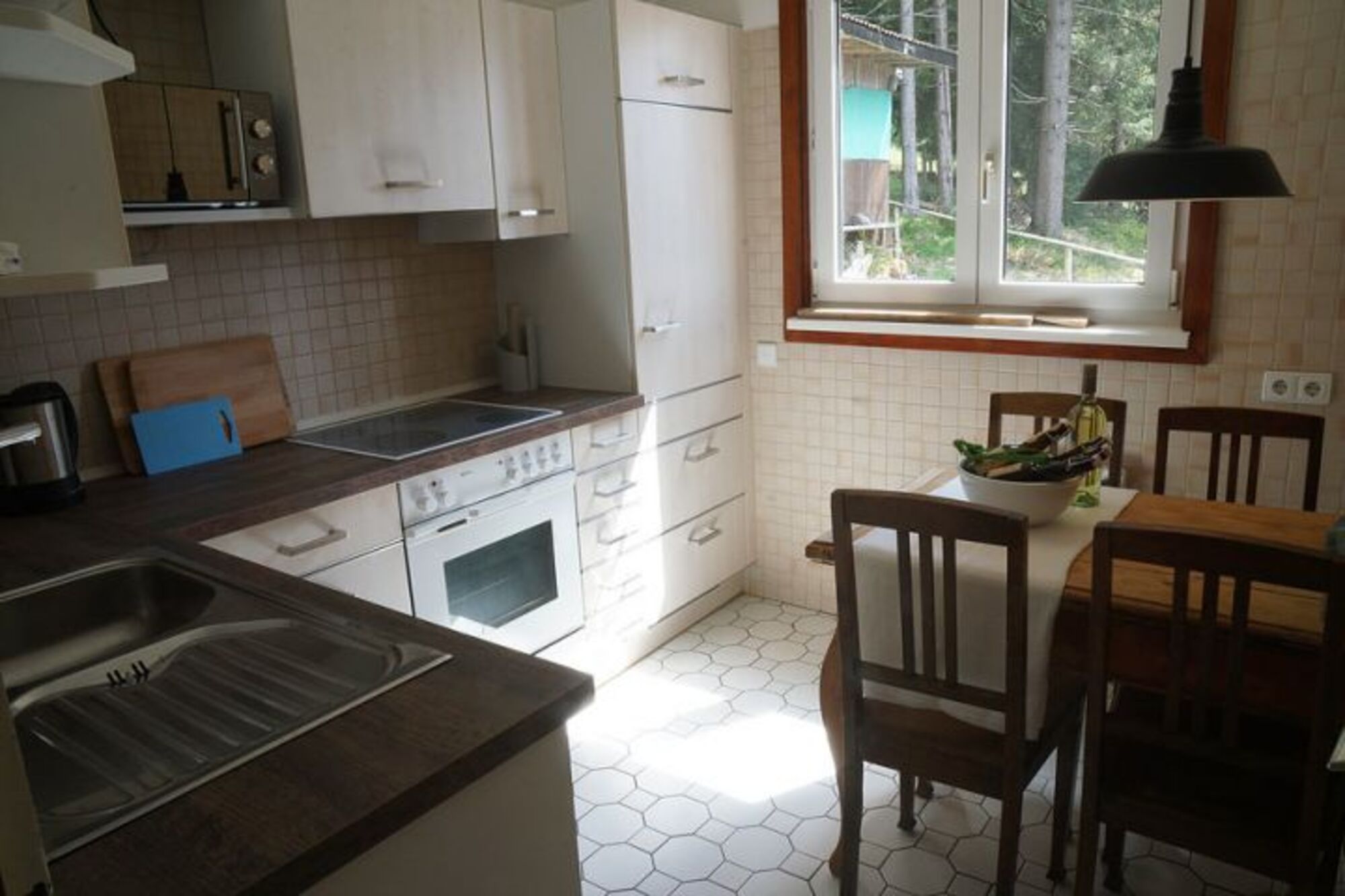 Innen erwarten Sie zwei gemütliche Doppelzimmer im Obergeschoss und ein Einzelzimmer im Erdgeschoss – ideal für bis zu 5 Personen. Das Wohnzimmer bietet einen Holzofen, eine Sitzecke mit TV und einen Essplatz vor dem Panoramafenster. Die Küche ist u.a. mit Umluft-Backofen, Ceranfeld, Kühlschrank und Spülmaschine ausgestattet. Ein Bad mit Dusche und WC, 500-Mbit-Glasfaseranschluss und kostenloses WLAN im ganzen Haus sorgen für Komfort.