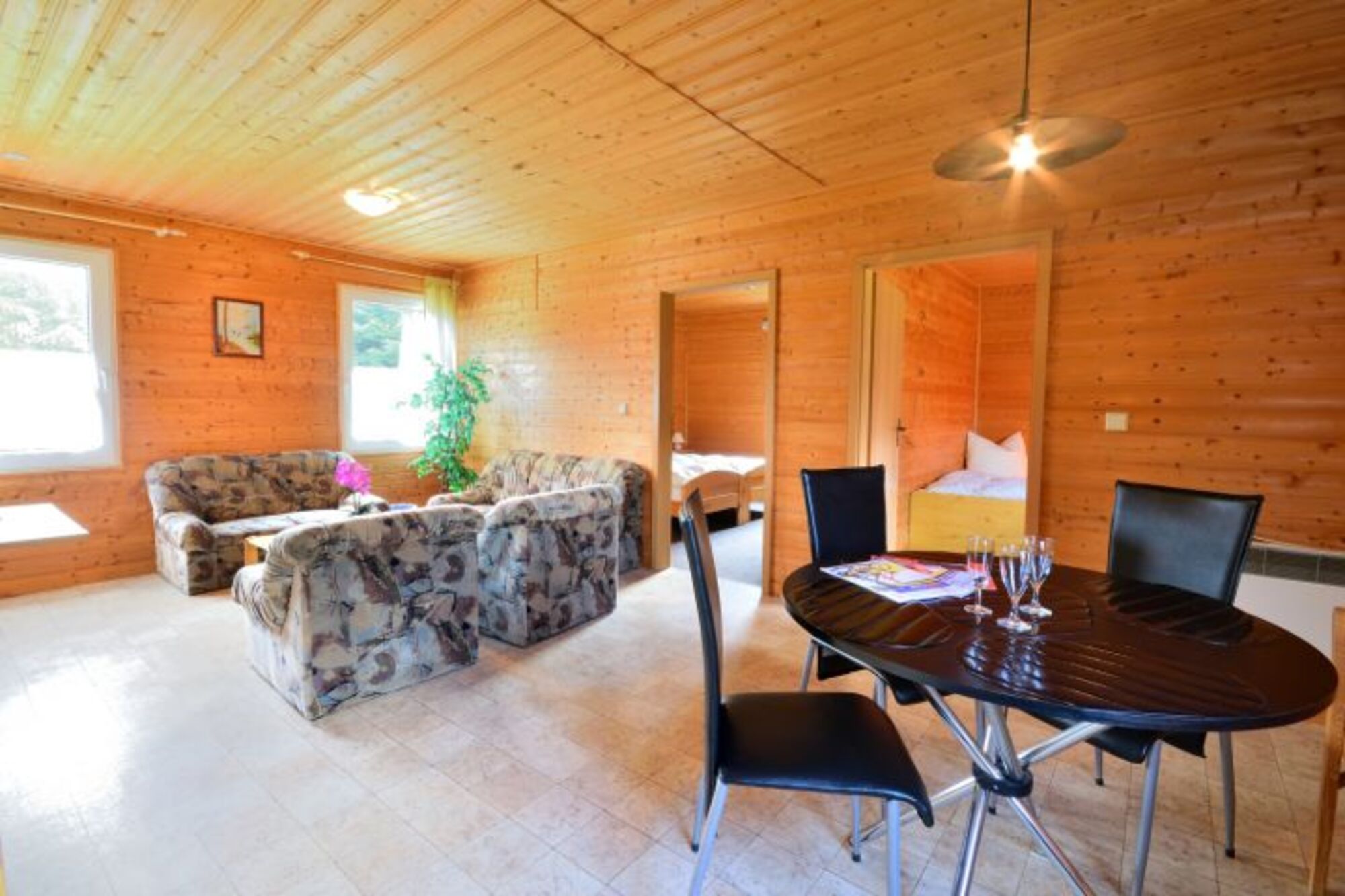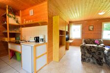 Auf 60 m² bietet das Haus ausreichend Platz für bis zu 4 Personen + Kleinkind. Das Holzhaus hat eine Ebene und besitzt 2 Schlafzimmer (mit je 2 Einzelbetten), 1 Wohnzimmer mit integrierter Küchenzeile und Essbereich und ein Duschbad. Vor dem Haus steht Ihnen eine große Naturterrasse zur Verfügung. Sie können den Blick auf den Wald genießen. Das Haus ist hundesicher eingezäunt. Kostenfreies WLAN ist auf dem Grundstück vorhanden.