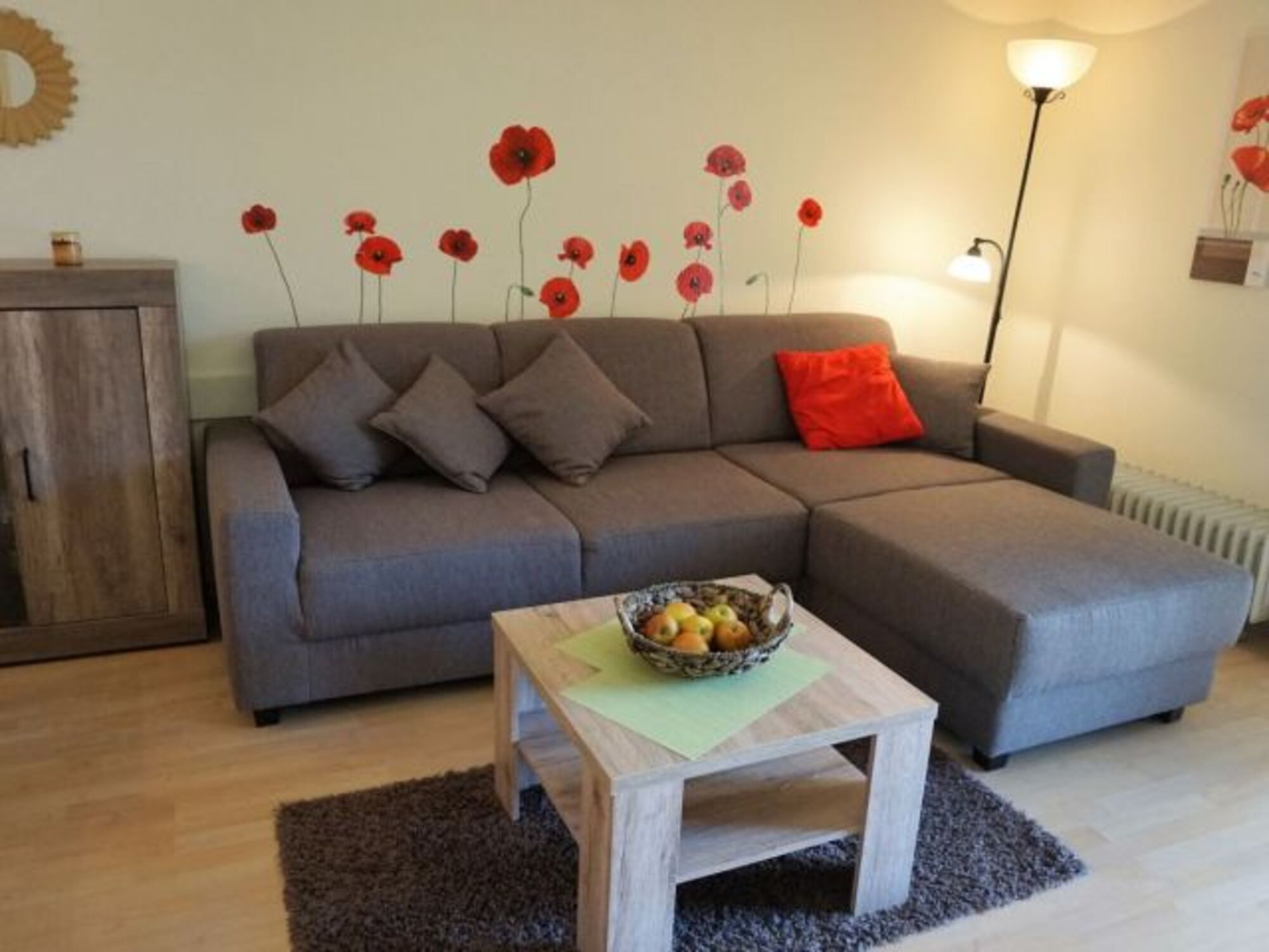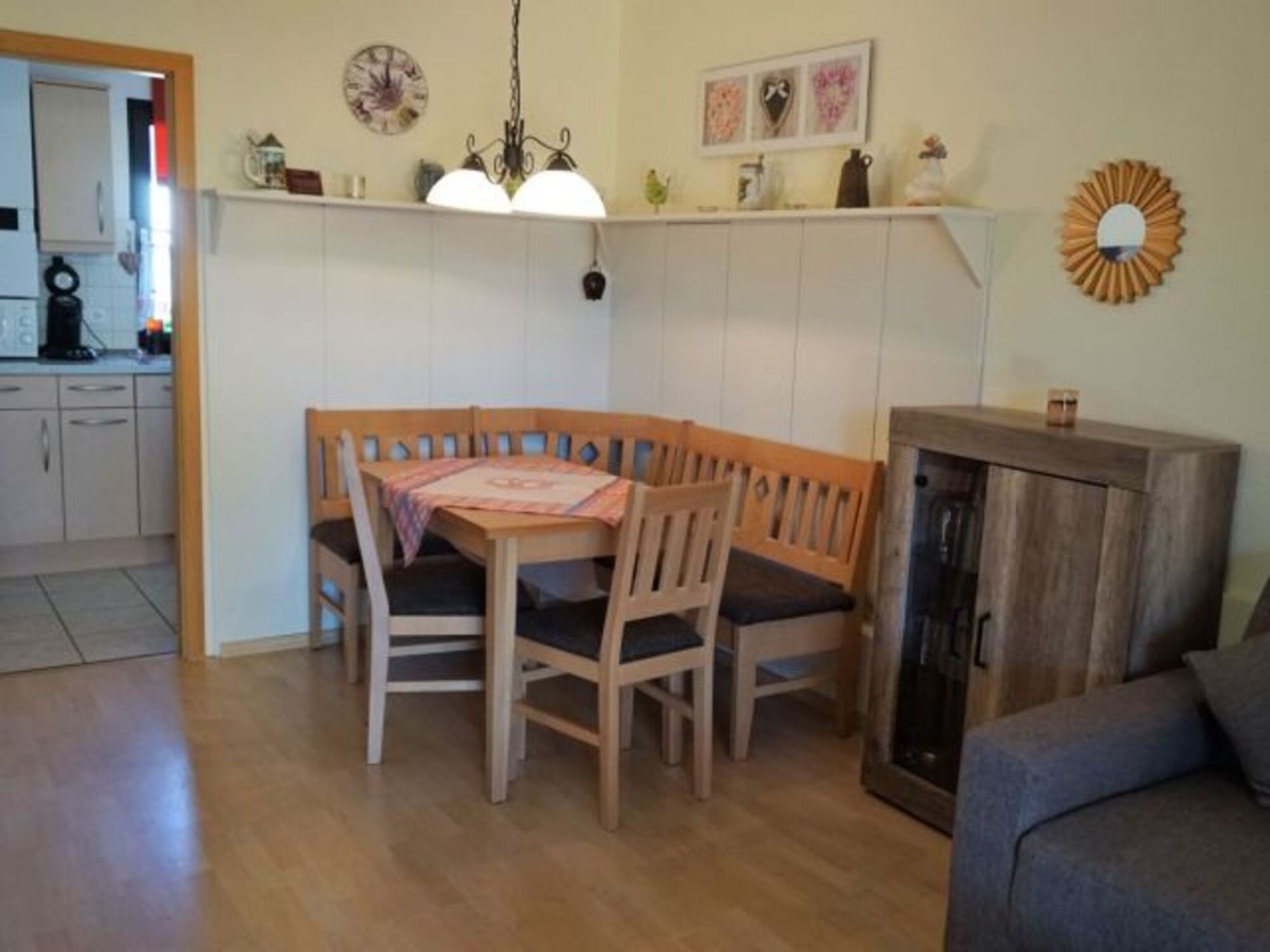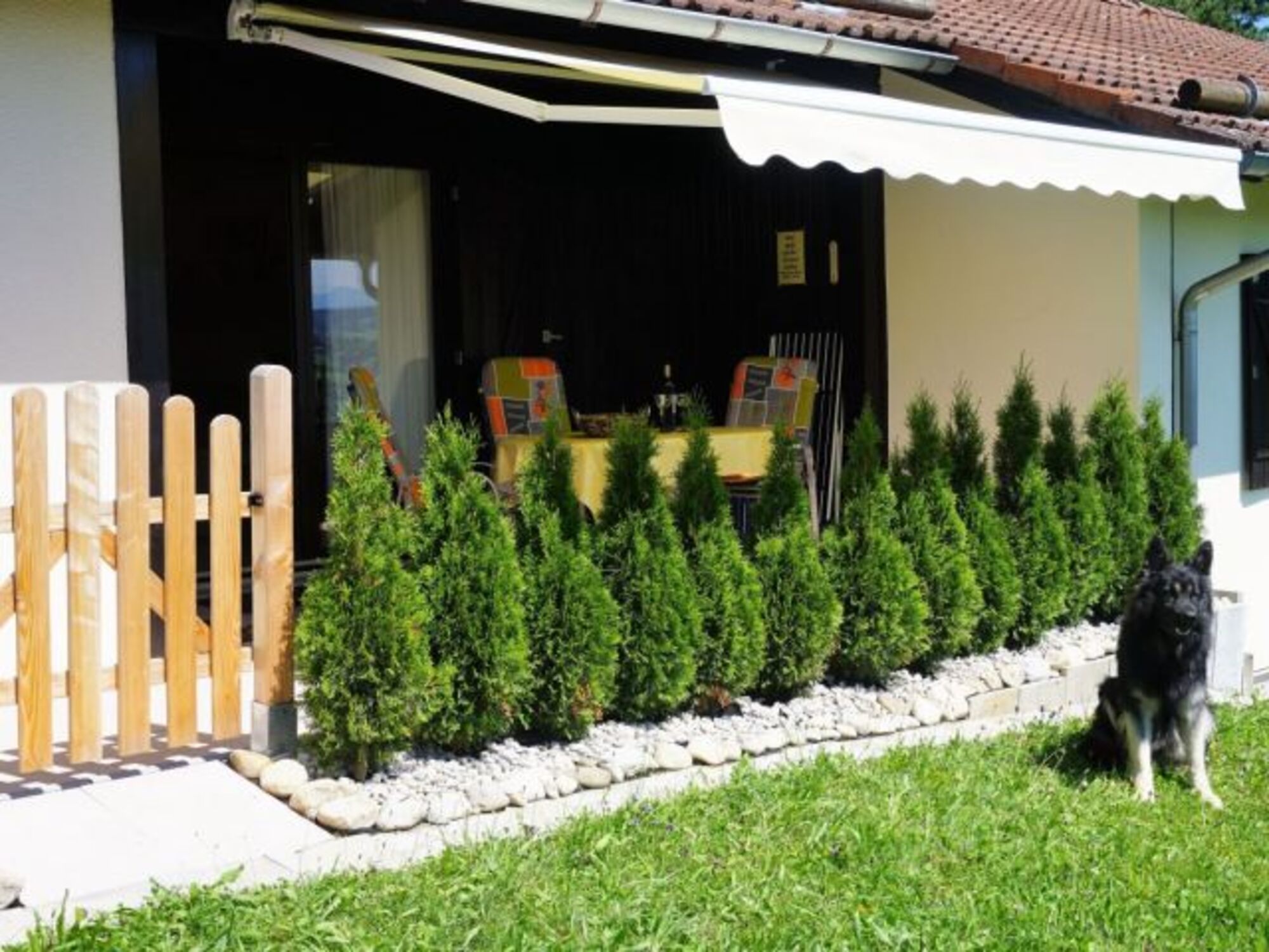 Ein kleines Stück Wiese befindet sich direkt vor der Süd-Terrasse. Die Terrasse ist mit niedriger Hecke eingefriedet, ein Türchen lässt sich einhängen, so daß Ihr Vierbeiner sich im Terrassenbereich frei aufhalten kann. Zudem ist ein Haken für eine Leine angebracht.