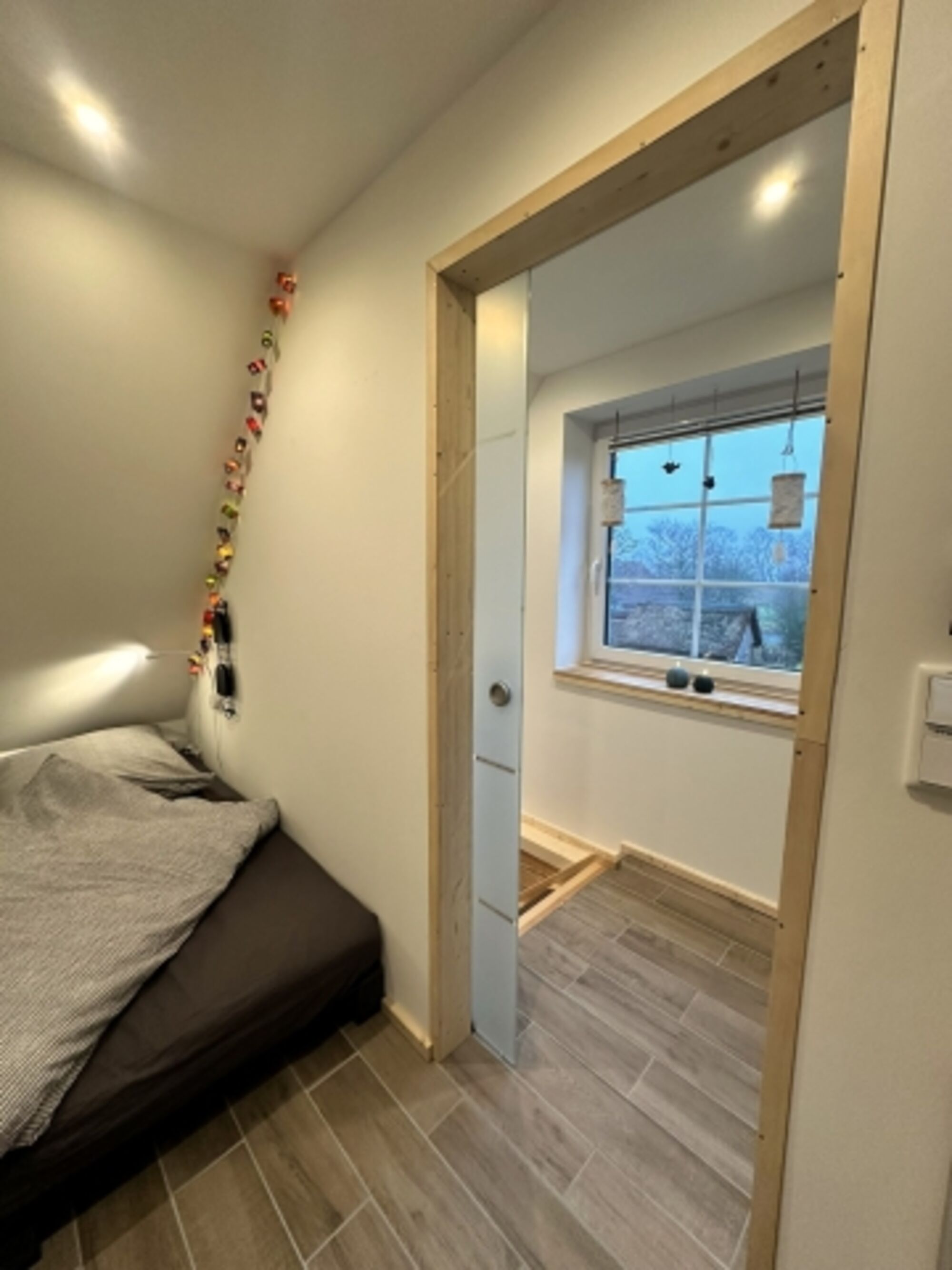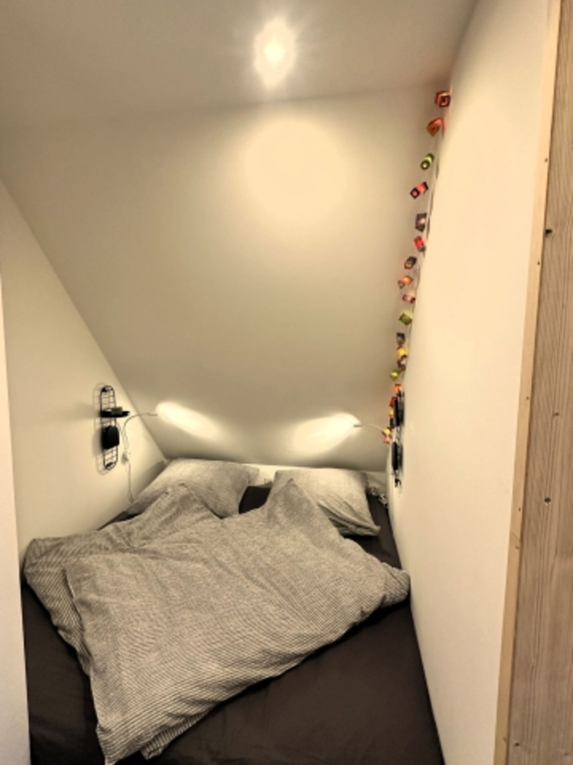 Kuschelige Schlafnische mit Palettenbett und Feenlichterkette für gemütliche Momente. Doppelbett 1,80 x 2,00m, Kommode, Wecker, Spiegel, Leselampe am Bett