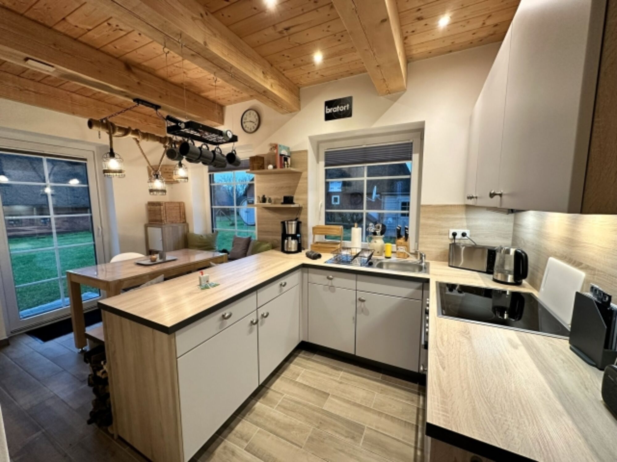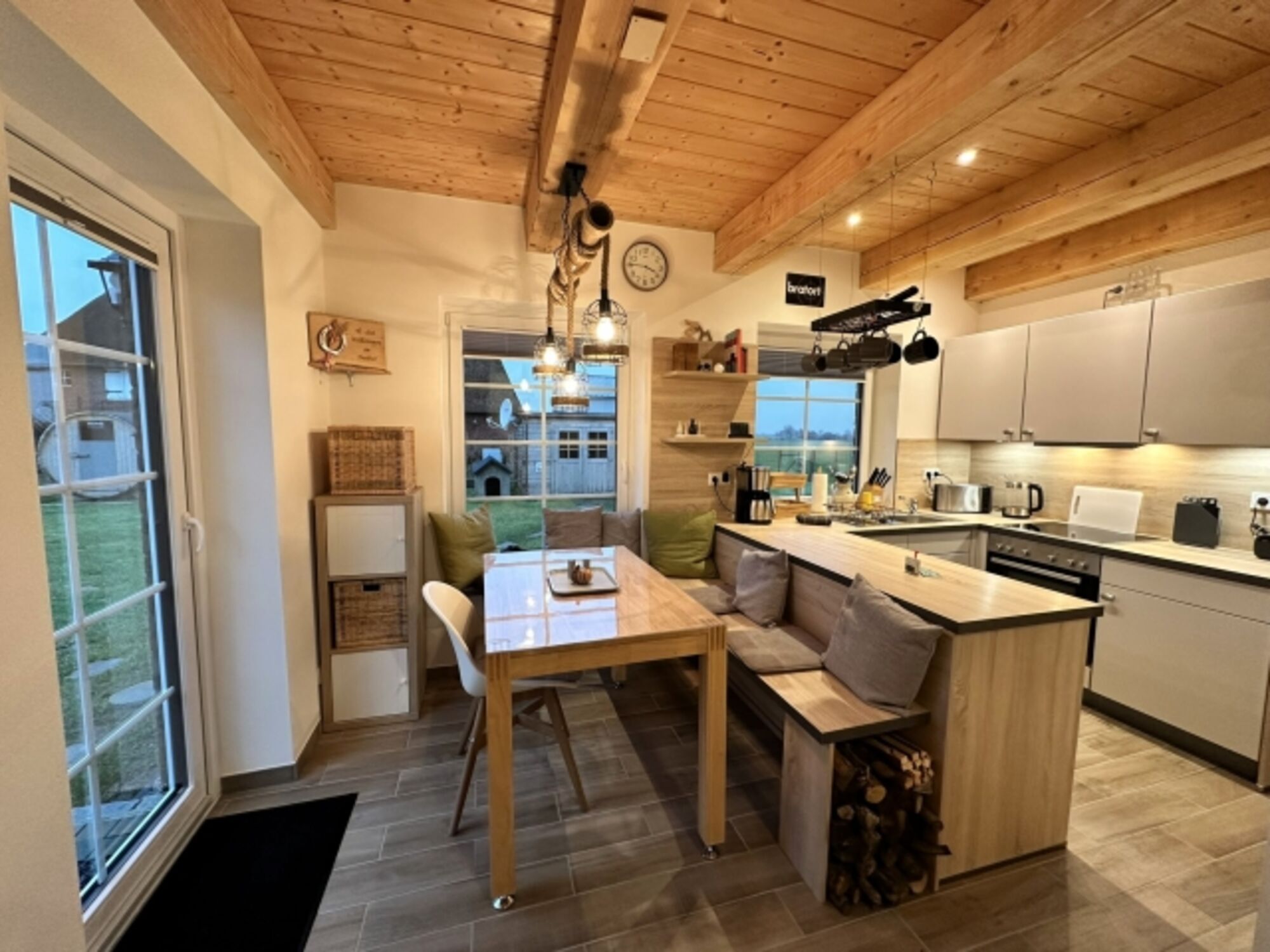 Cerankochfeld, Dunstabzugshaube, Kühlschrank mit Gefrierfach, Mixer, Waffeleisen, Gewürze (Salz, Pfeffer, Zucker), Geschirrhandtücher, Essplatz in der Küche