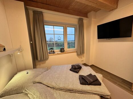 Verdunkelnde Gardinen schaffen eine Umgebung für tiefen Schlaf, nach ereignisreichen Tagen an und in der Nordseeluft. Doppelbett 1,60 x 2,00m, Wecker, Leselampe am Bett