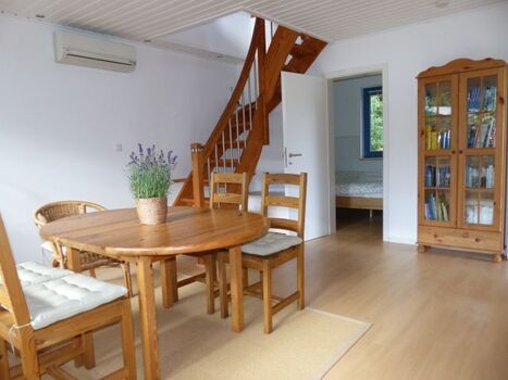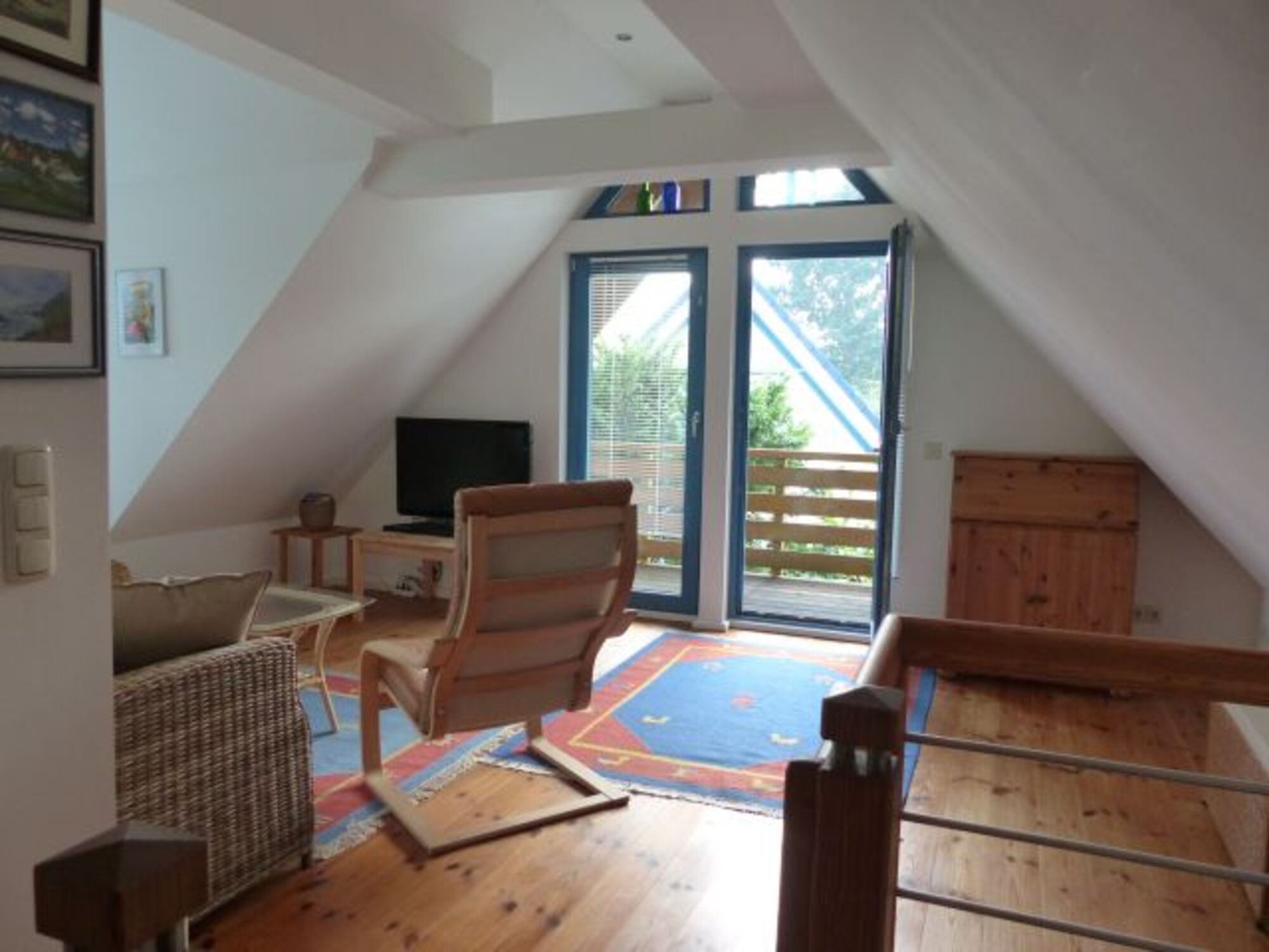 Es verfügt über insgesamt drei Schlafzimmer, wovon sich zwei im Erdgeschoss und eines im Obergeschoss befinden. Ebenfalls im Obergeschoss gibt es eine offene Galerie als gemütlichen Rückzugspunkt zum Entspannen. Auf dem Balkon nach West lassen sich gemütliche Abende bei einem Glas Wein und den entspannenden Geräuschen des angrenzenden Wäldchens und der nahen Schlei verbringen.