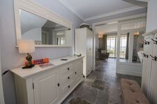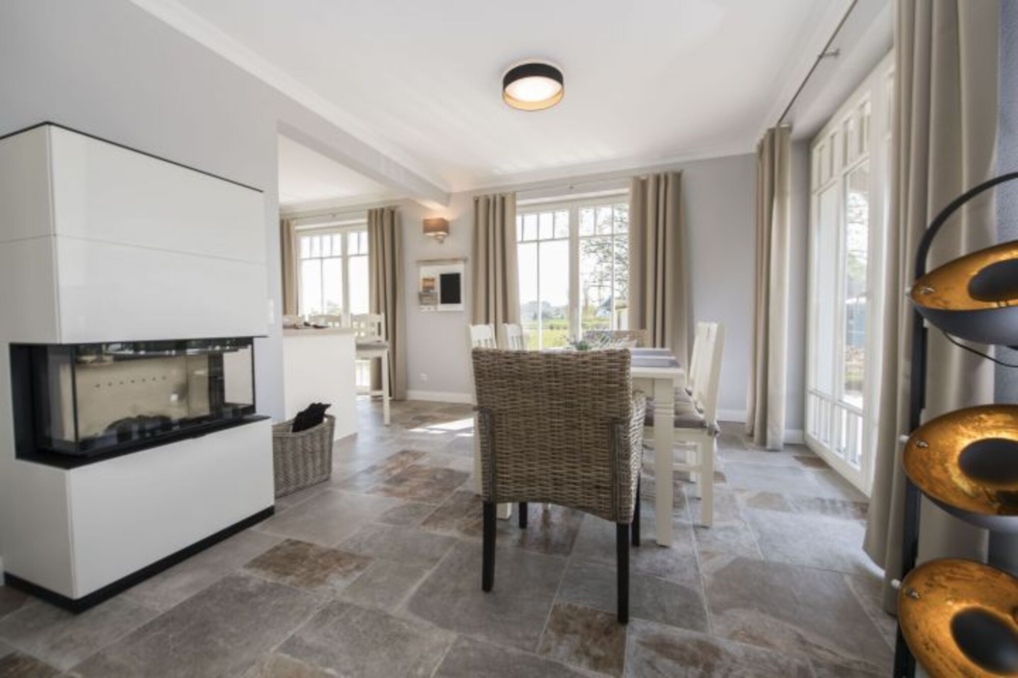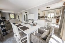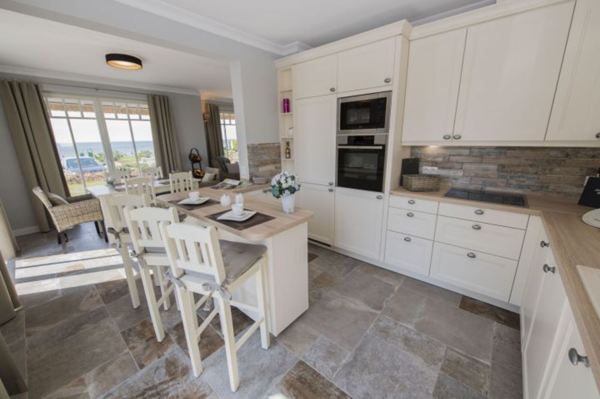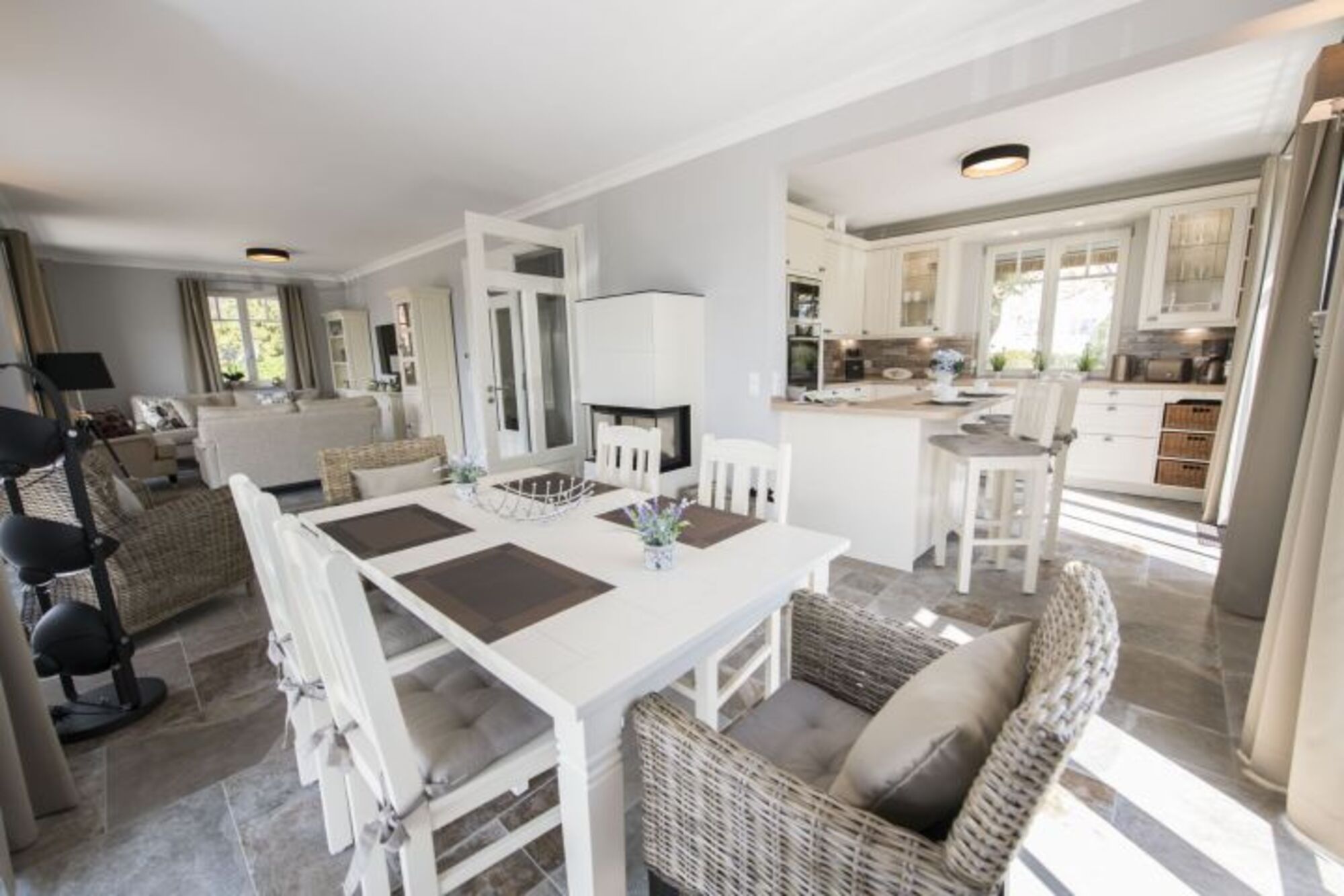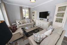 Im Erdgeschoss befindet sich neben einem Duschbad mit Waschmaschine der Wohnbereich mit TV, Sofas und Kamin. Esstisch für 6 Personen Das Wohnzimmer verfügt über eine gemütliche Sitzecke und eine Flachbild-TV. Im angrenzenden Küchenbereich befindet sich eine komplett ausgestattete Küchenzeile mit einem 4-Zonen-Induktionskochfeld, Backofen, Mikrowelle, Geschirrspüler, Kühlschrank mit Gefrierfach, Kaffeemaschine, Toaster, Wasserkocher und diversem Kleininventar. Ein Küchentresen mit Hockern komplettiert die hochwertige Einrichtung.