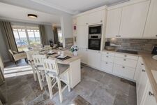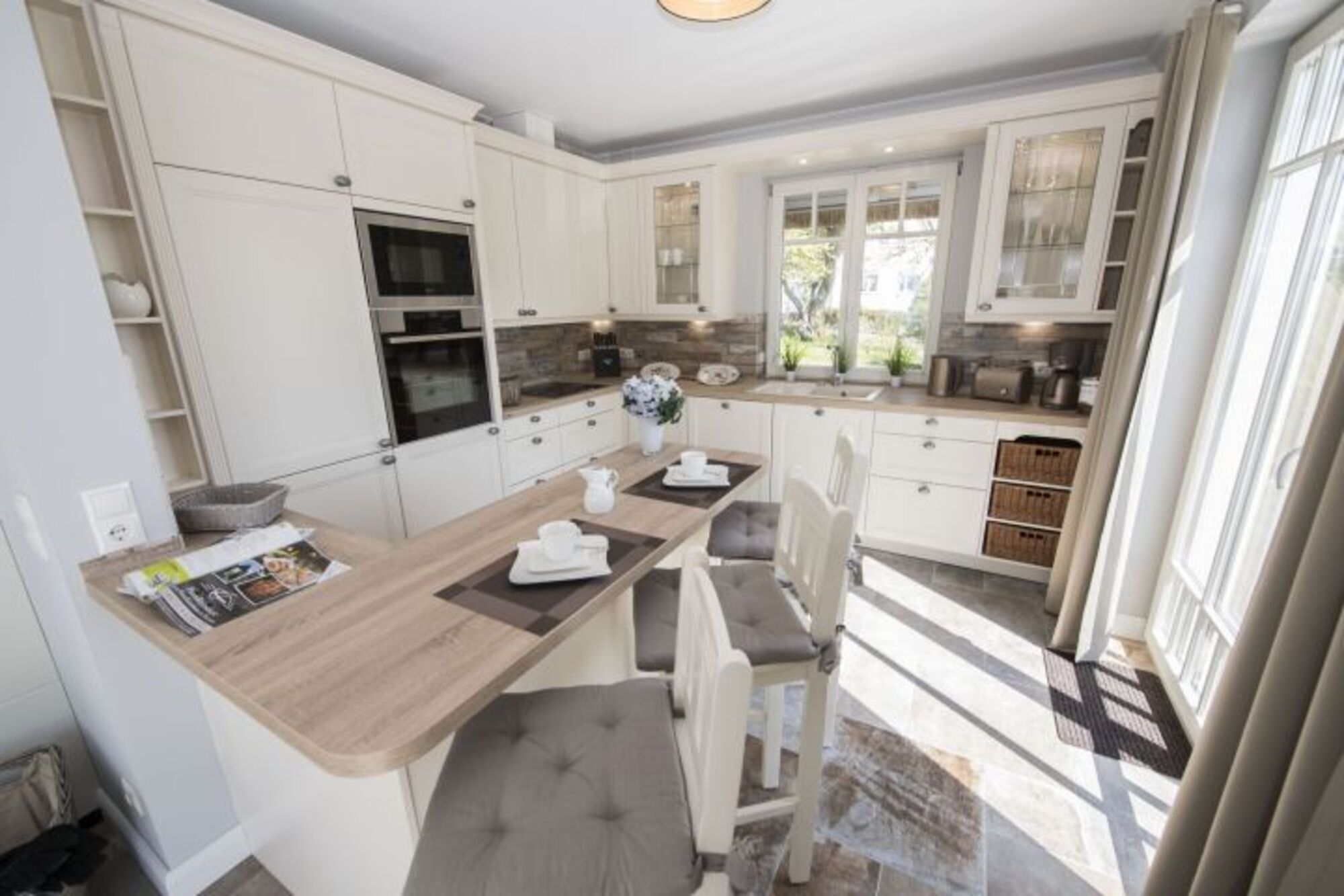 Cerankochfeld, Induktionsherd, Dunstabzugshaube, Kühlschrank mit Gefrierfach, Korkenzieher / Flaschenöffner, Essplatz in der Küche