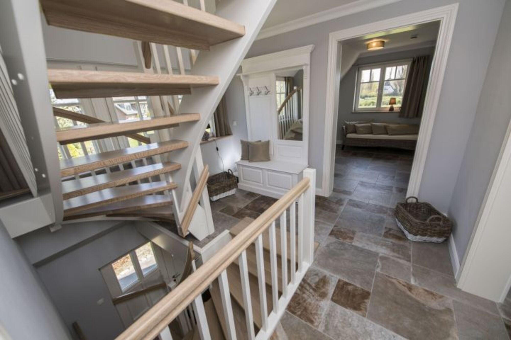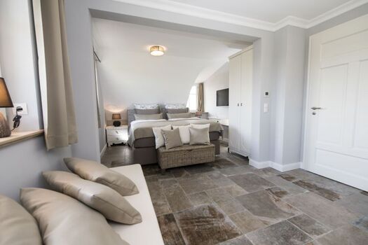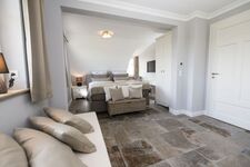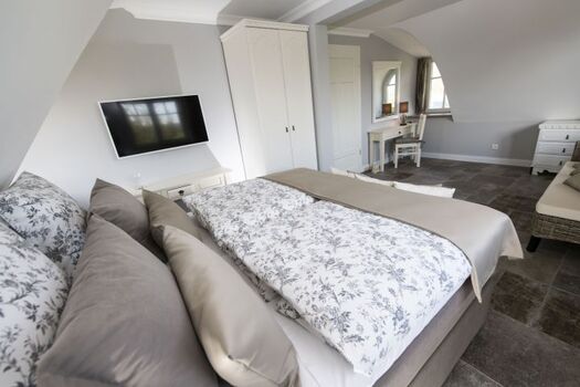 Im Obergeschoss des Hauses gibt es zwei geräumige Schlafzimmer mit je einem großen, bequemen Doppelbett (1.80 m x 2.00 m) und eigenen Flachbild-TV. Je ein Kleiderschrank bietet ausreichend Platz für Ihre Urlaubsgarderobe. In einem der Schlafzimmer gibt es zusätzlich einen separaten Ankleidebereich, in dem ein Recamiere zum Platznehmen einlädt. Das Highlight auf dieser Etage ist das zweite Bad dieses Hauses: Eine große Walk-In-Dusche, Badewanne, Bidet, Flachbild-TV und die Sauna mit herrlichem Ausblick machen aus diesem Raum eine wahre Wellness-Oase.