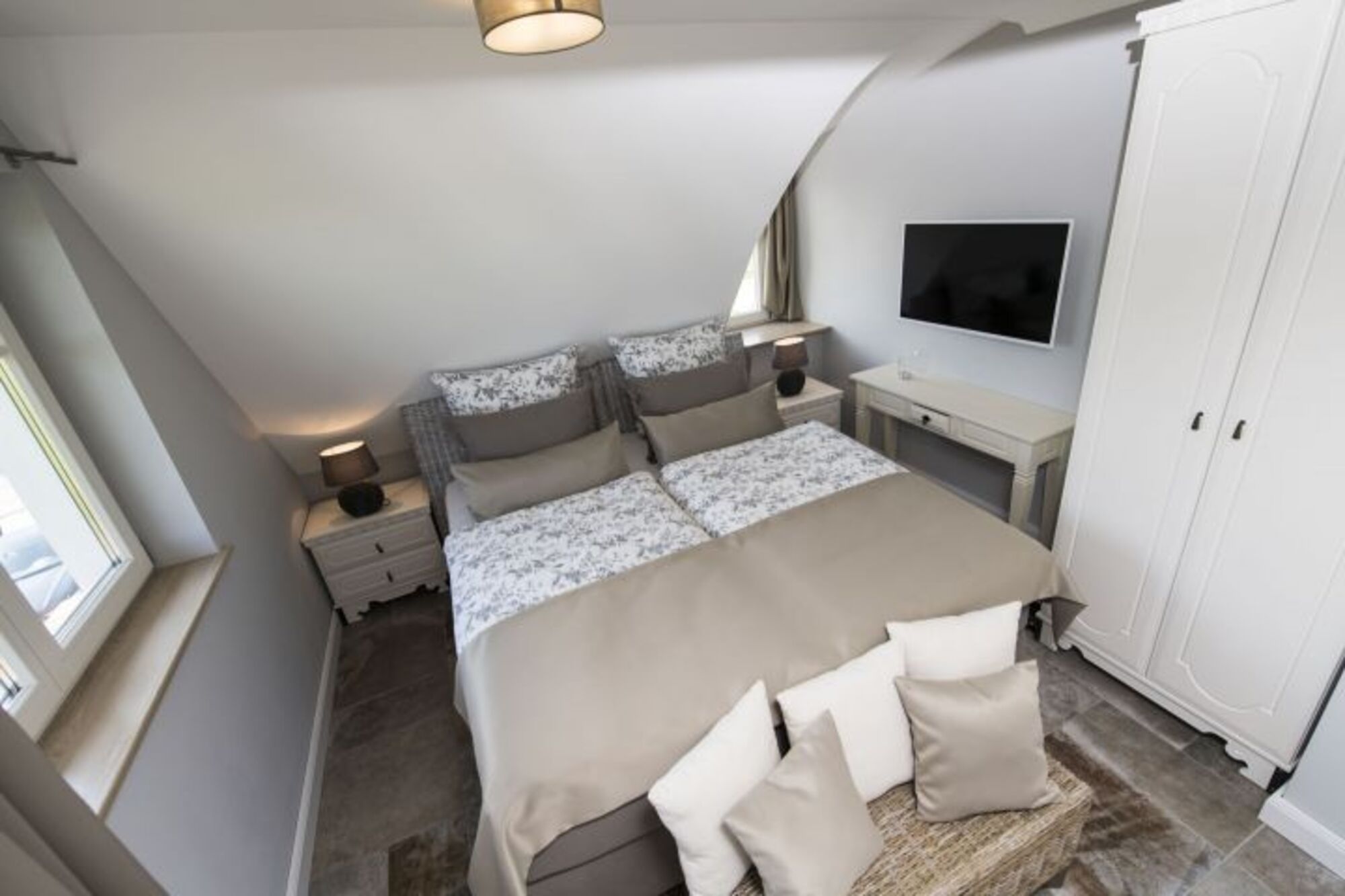 An den Fenstern befinden sich Verdunklungsrollos. In einem der Schlafzimmer gibt es zusätzlich einen separaten Ankleidebereich mit Recamiere. Doppelbett 1,80 x 2,00m, Leselampe am Bett