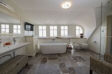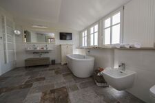 Das Badezimmer im 1. Obergeschoss verfügt zusätzlich über ein Bidet sowie einen Fernseher. Waschbecken, Spiegel