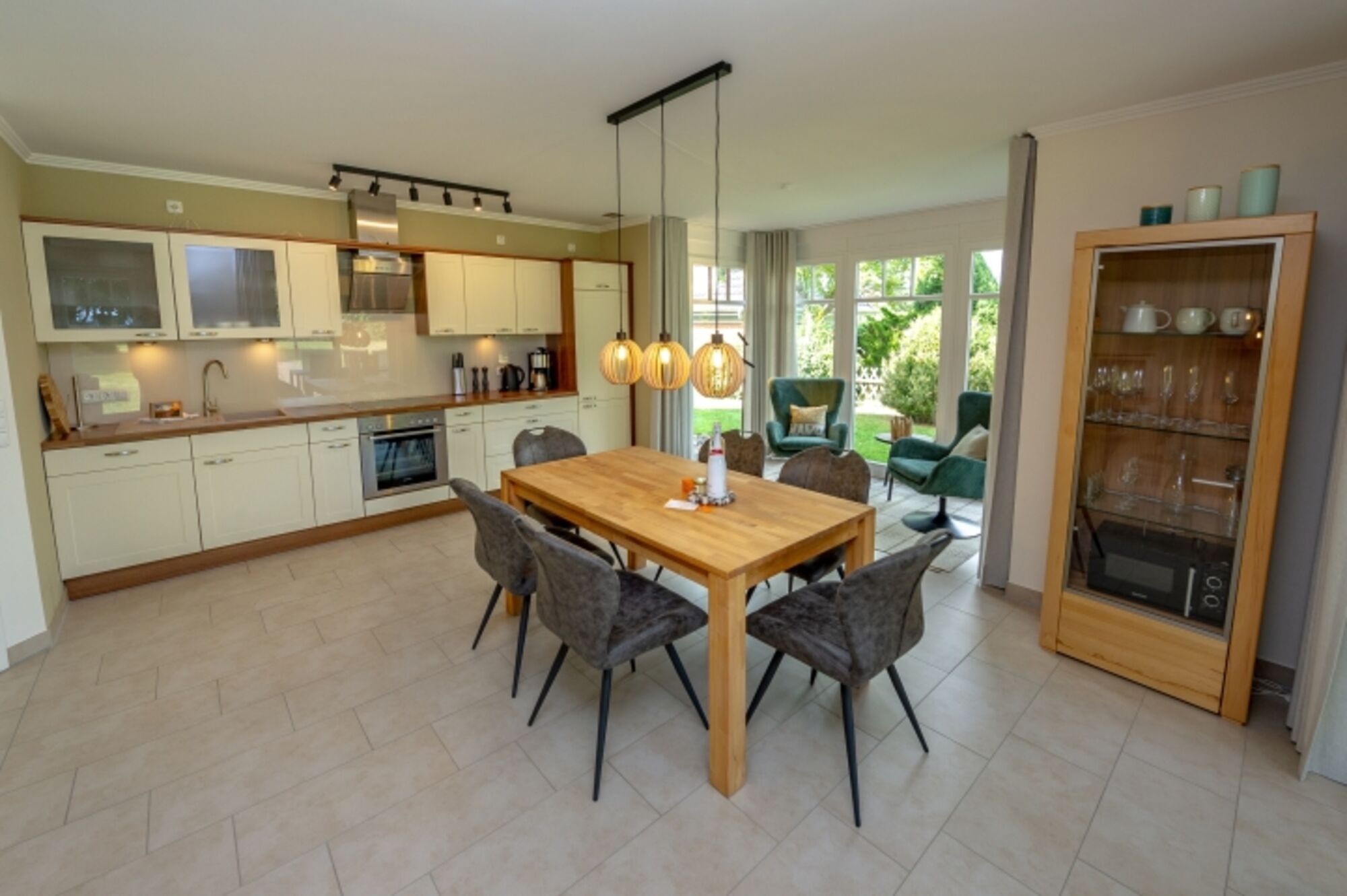Cerankochfeld, Gasofen / Gasherd, Dunstabzugshaube, Kühlschrank mit Gefrierfach, Senseo-Kaffeeautomat, Korkenzieher / Flaschenöffner, Essplatz in der Küche
