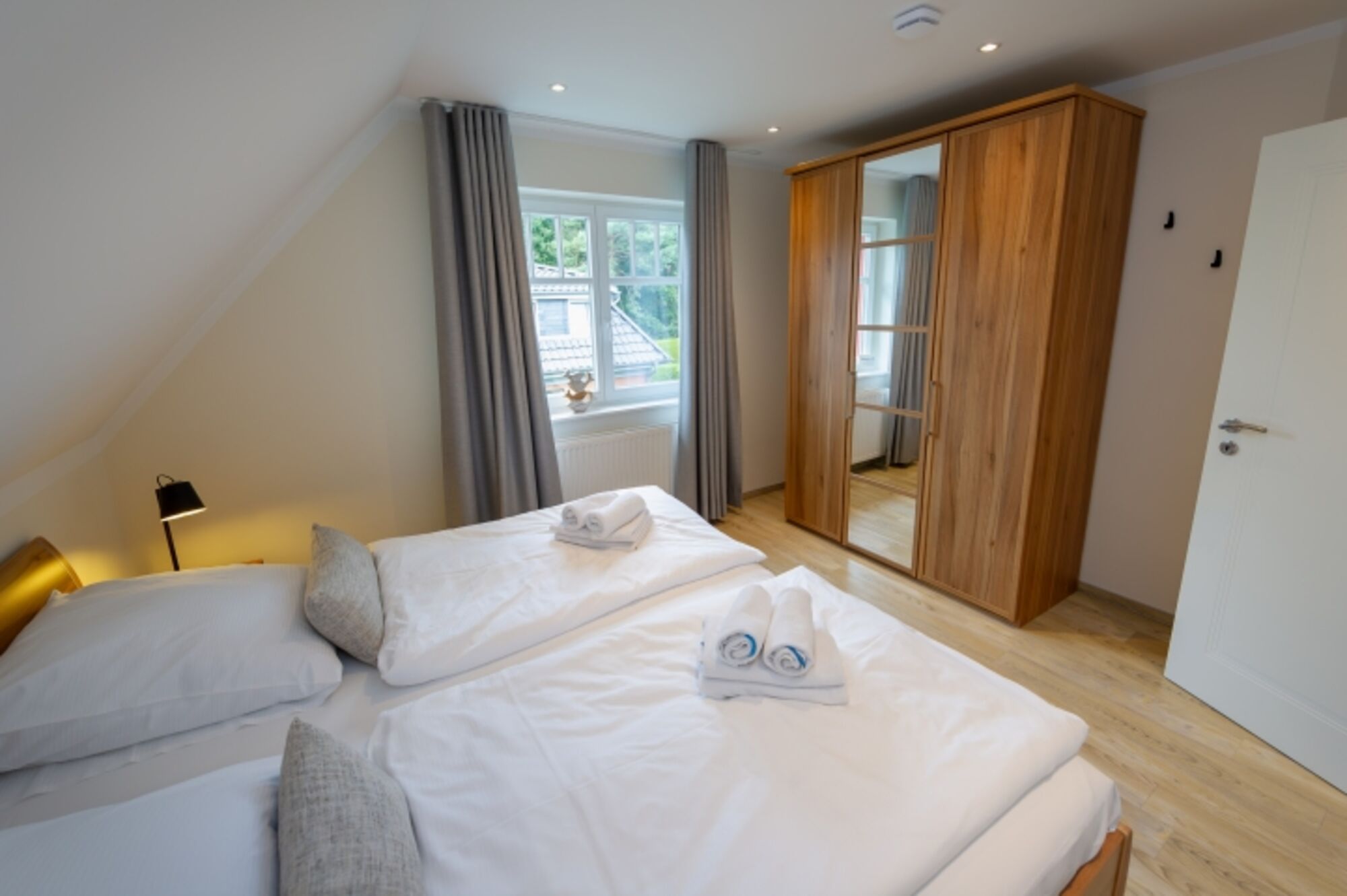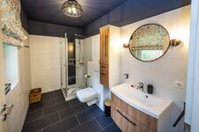 Ein paar Treppenstufen höher warten im Obergeschoss drei Schlafzimmer mit bequemen Doppelbetten sowie ein großes Badezimmer mit Waschbecken, ebenerdiger Dusche, WC, Badewanne und privater Sauna auf Sie.