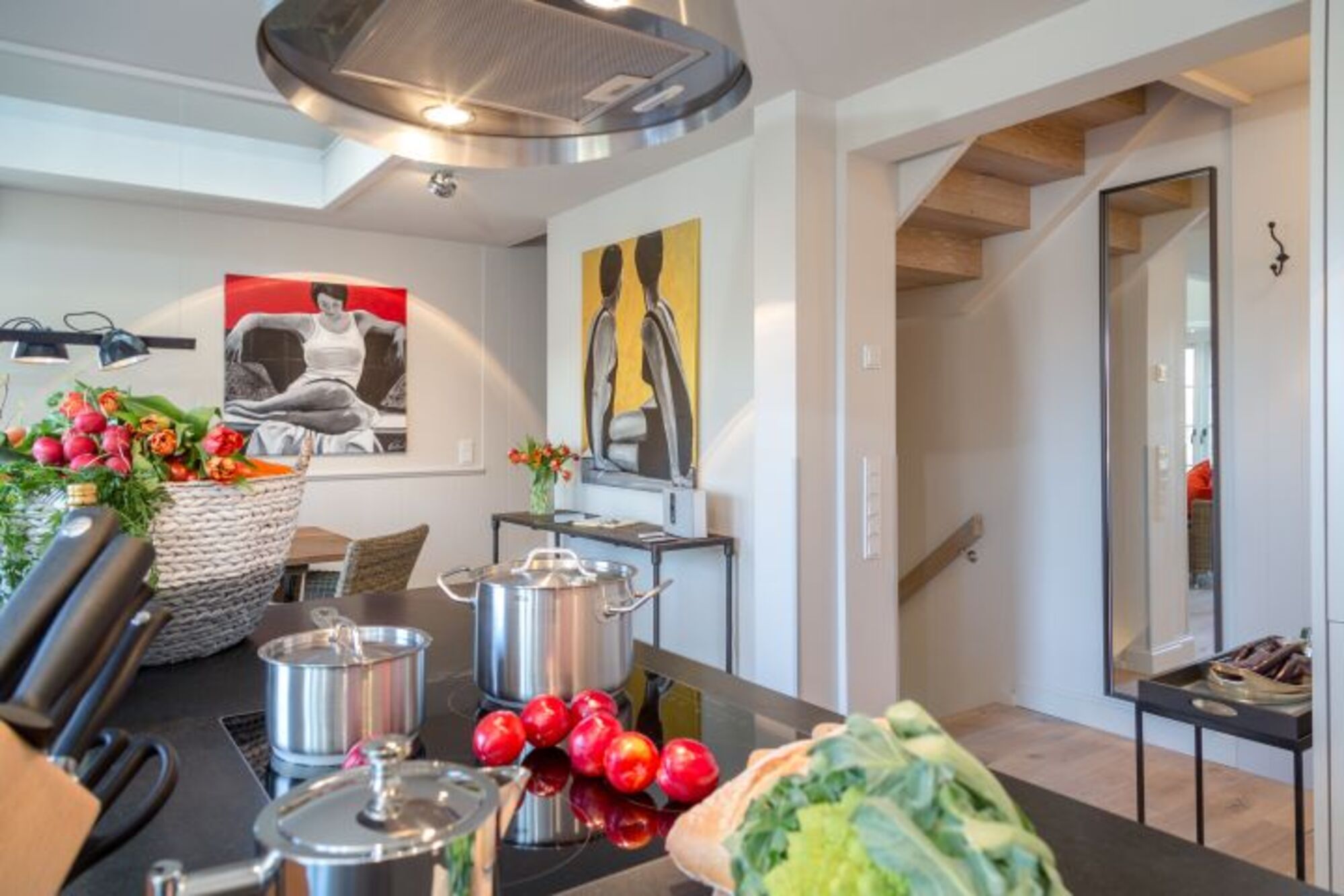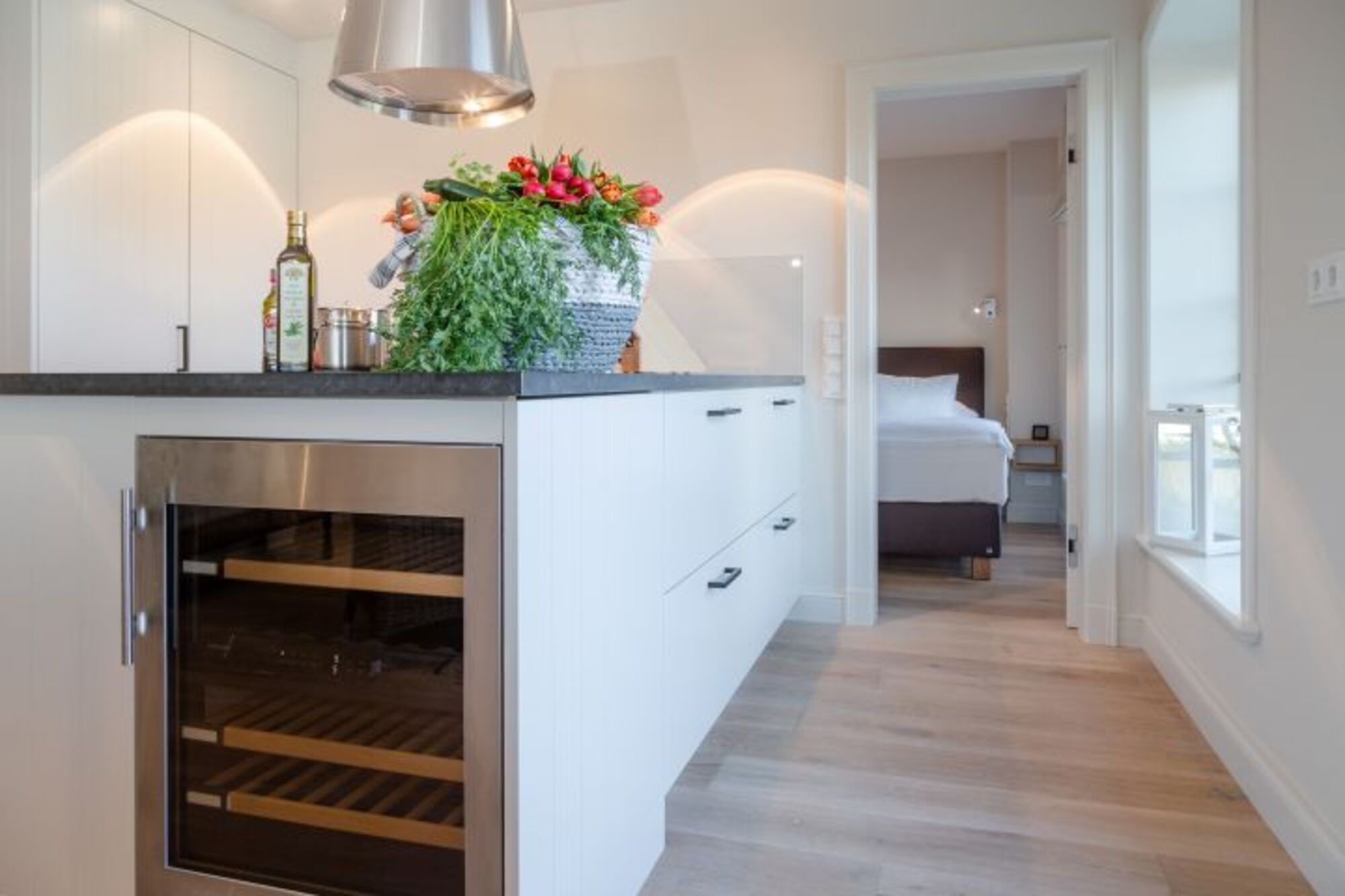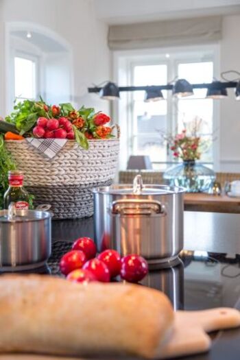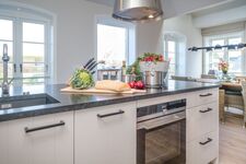 Die Küche ist offen zum Wohnzimmer gestaltet und vollumfänglich ausgestattet. Hier finden Sie alles, was Sie für einen gelungenen Aufenthalt benötigen: Von der Spülmaschine über die moderne Induktionsplatte bis hin zu einer Nespresso-E Kaffeemaschine – Sie können Ihrer Kreativität beim Kochen freien Lauf lassen. Außerdem stehen Ihnen Geschirr und Besteck, Küchengeräte wie Toaster und Wasserkocher sowie ein Kühlschrank mit Gefrierfach zur Verfügung.