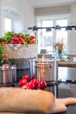 4-Platten Herd, Cerankochfeld, Dunstabzugshaube, Kühlschrank mit Gefrierfach, Gefrierschrank, Nespresso-Automat, Eierkocher, Mixer, Korkenzieher / Flaschenöffner, Geschirrhandtücher, Mülltüten, Essplatz in der Küche